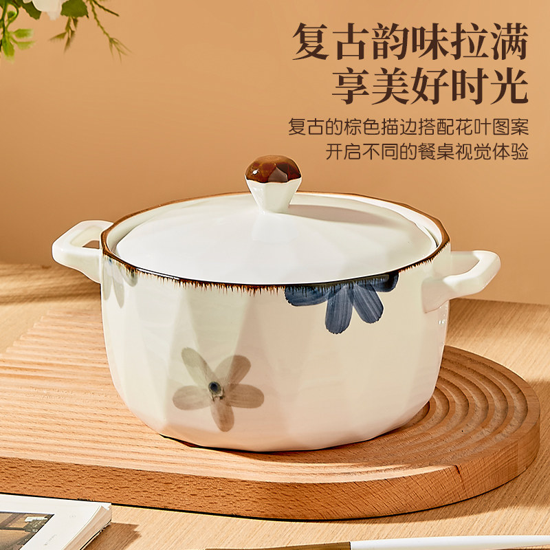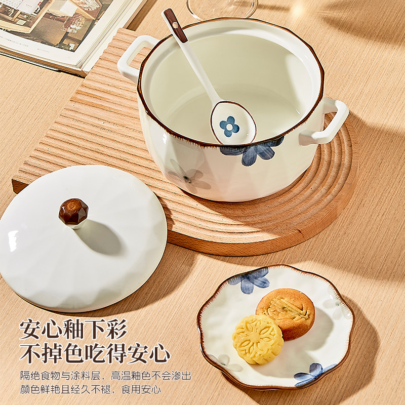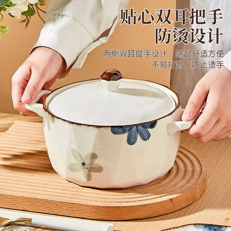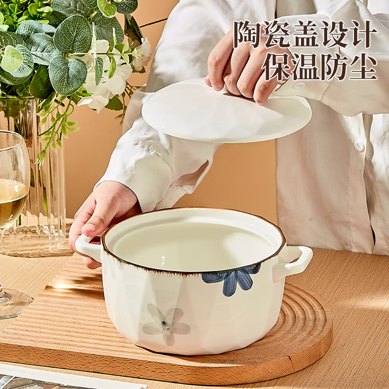 📚 日式大号釉下彩陶瓷双耳汤碗带盖个人宿舍家用新款大碗泡面碗汤盆