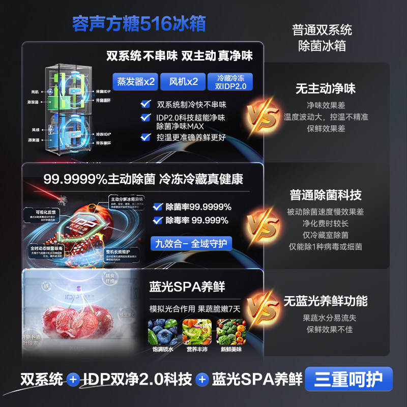 📚 容声冰箱方糖516L主动双净双系统家用四开门超薄嵌入式风冷无霜