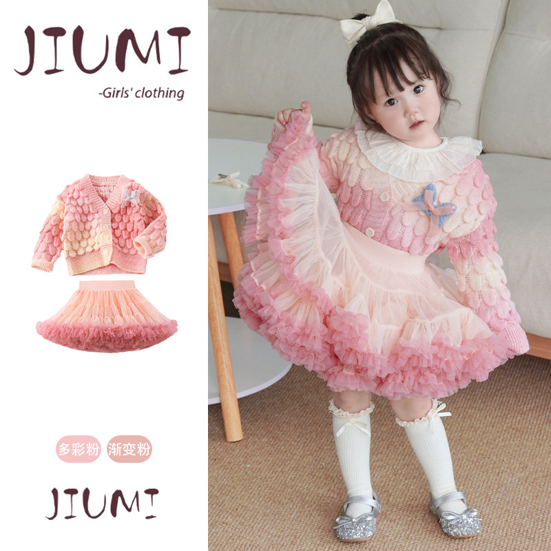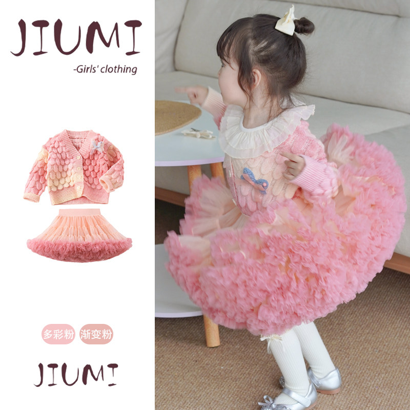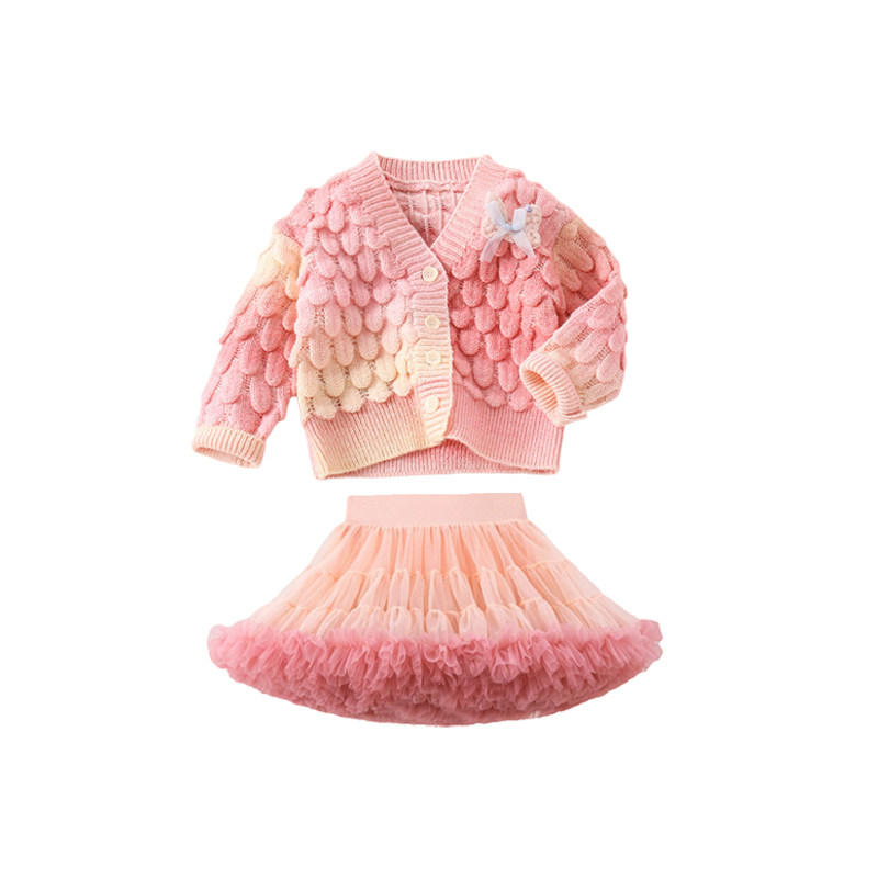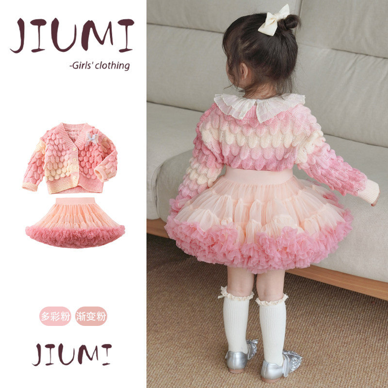 📚 女童春秋韩版甜美套装女宝宝渐变多彩针织开衫凸凸裙可爱甜美套装