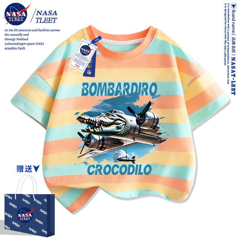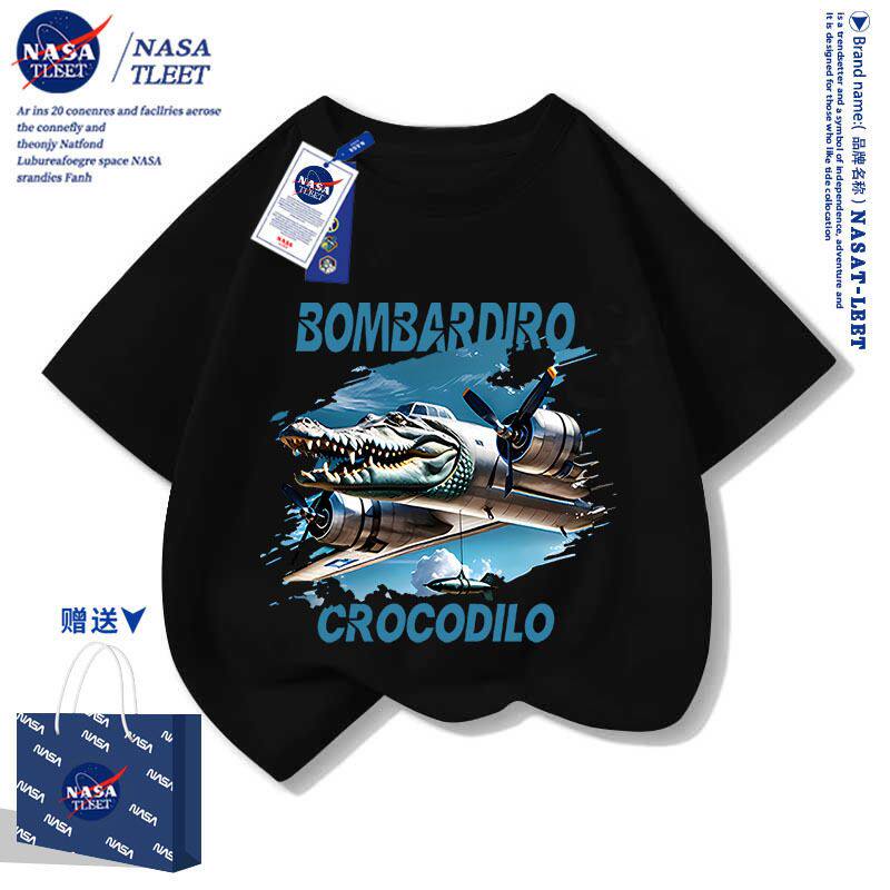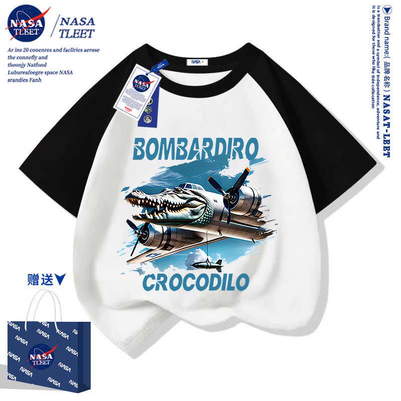 📚 NASA联名国外山海经木棍人鳄鱼战斗机印花短袖t恤童装潮流衣服新