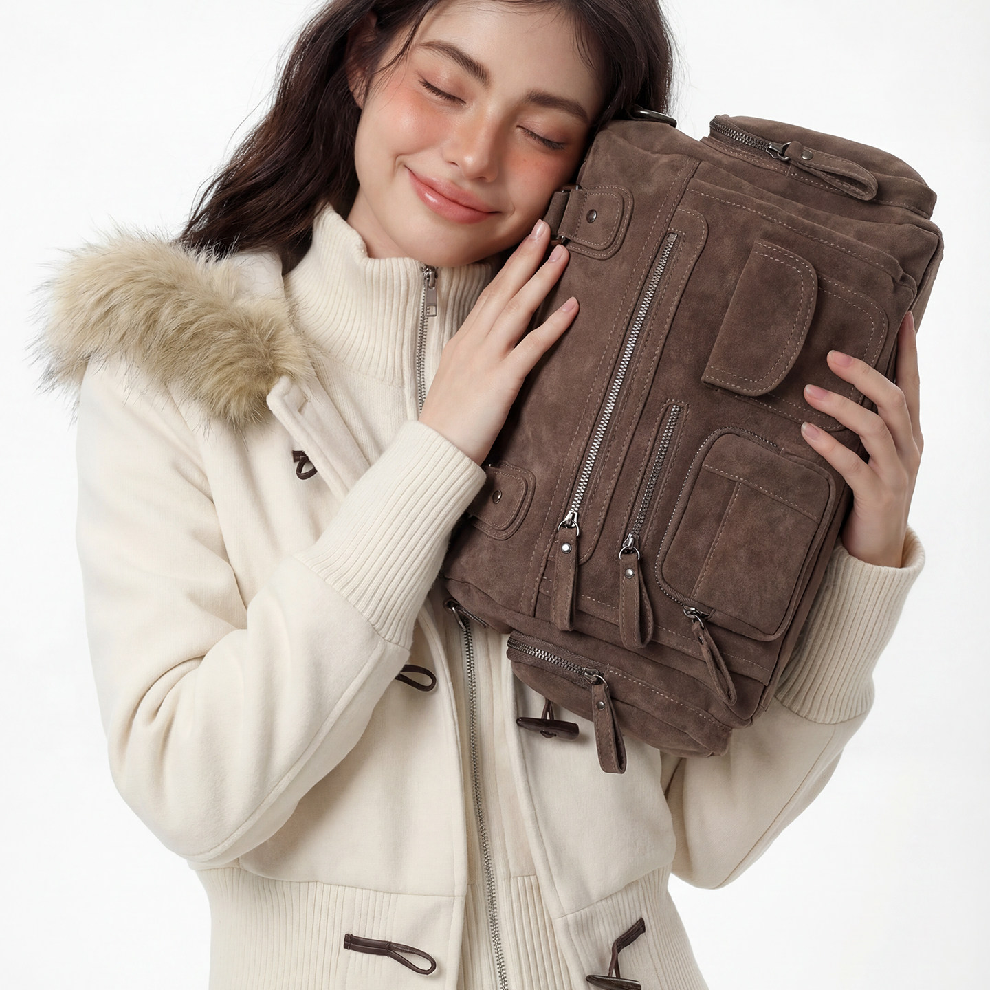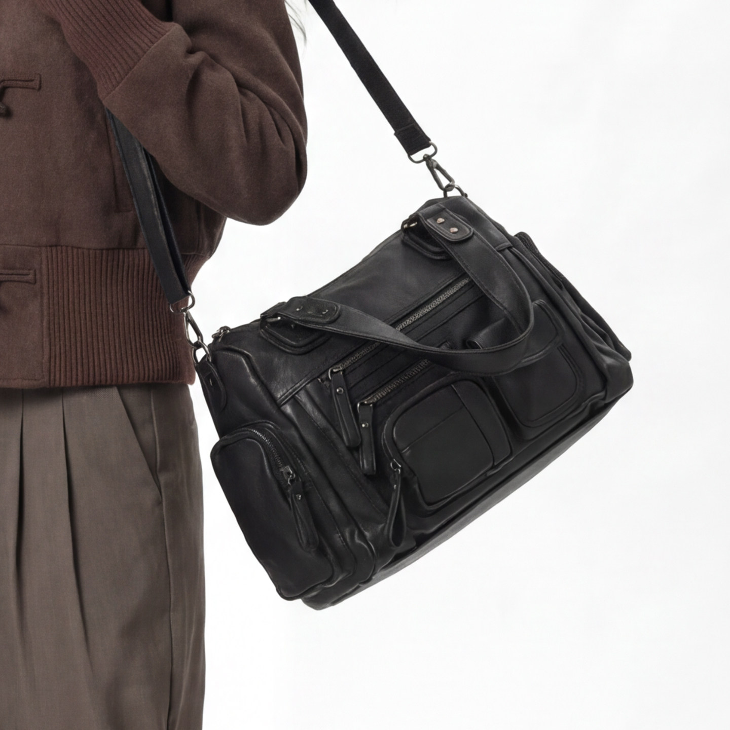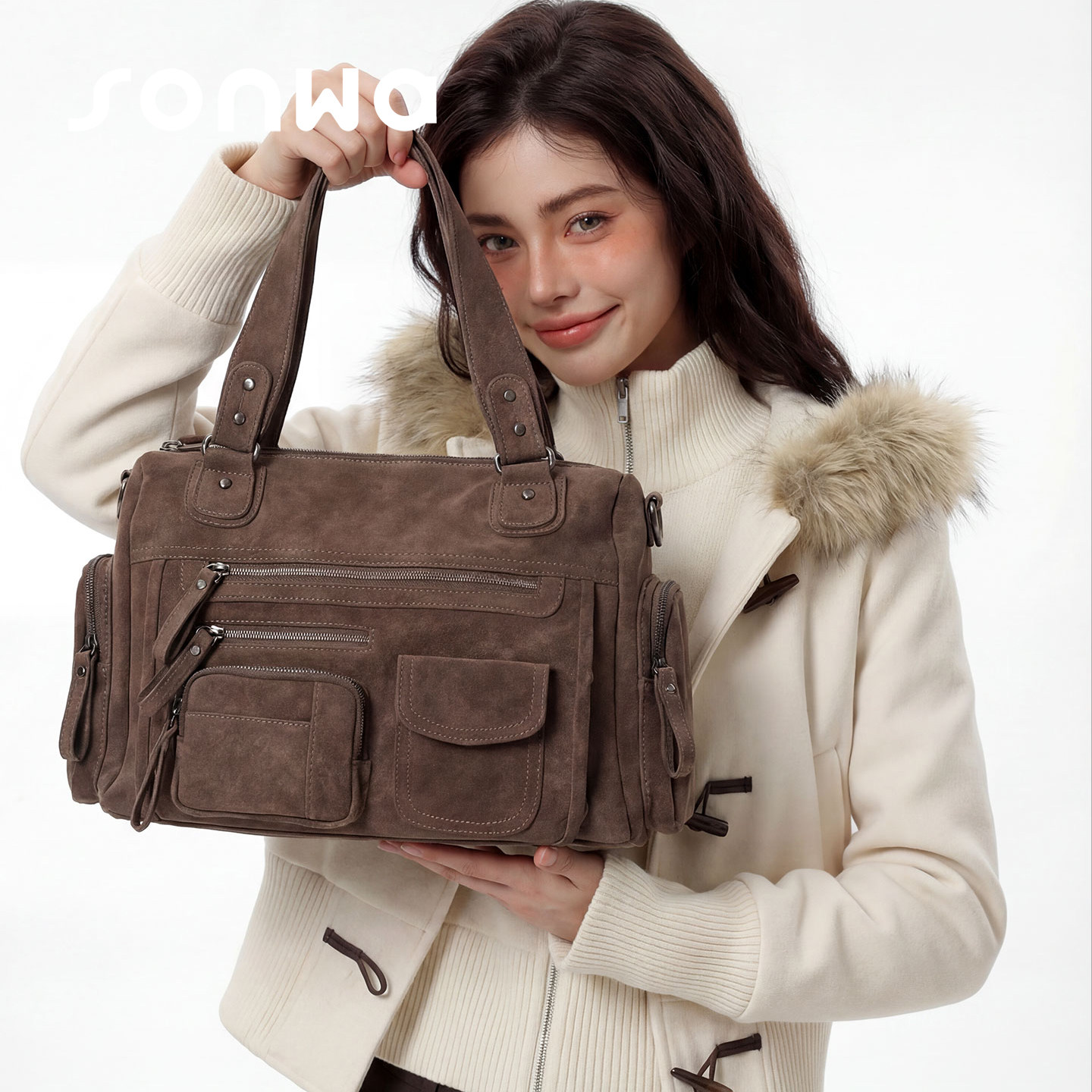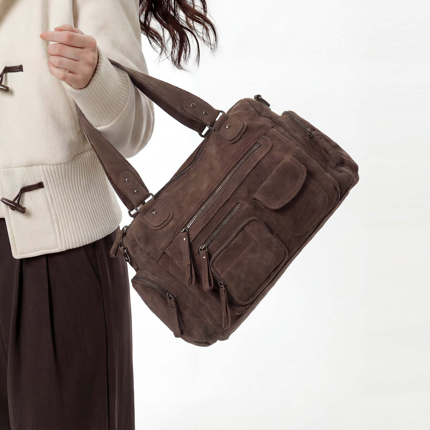 📚 SONWA/原创 莫里斯本机车包 麂皮绒水洗复古多口袋拉链单肩斜挎包
