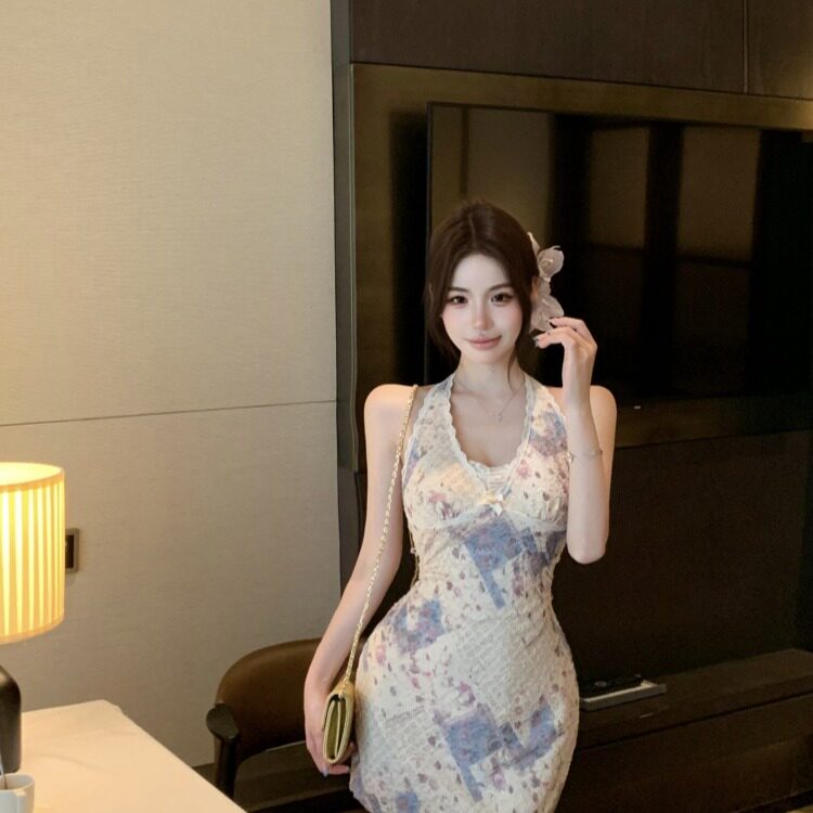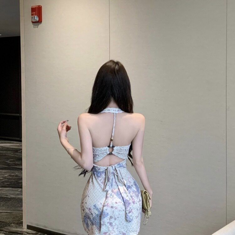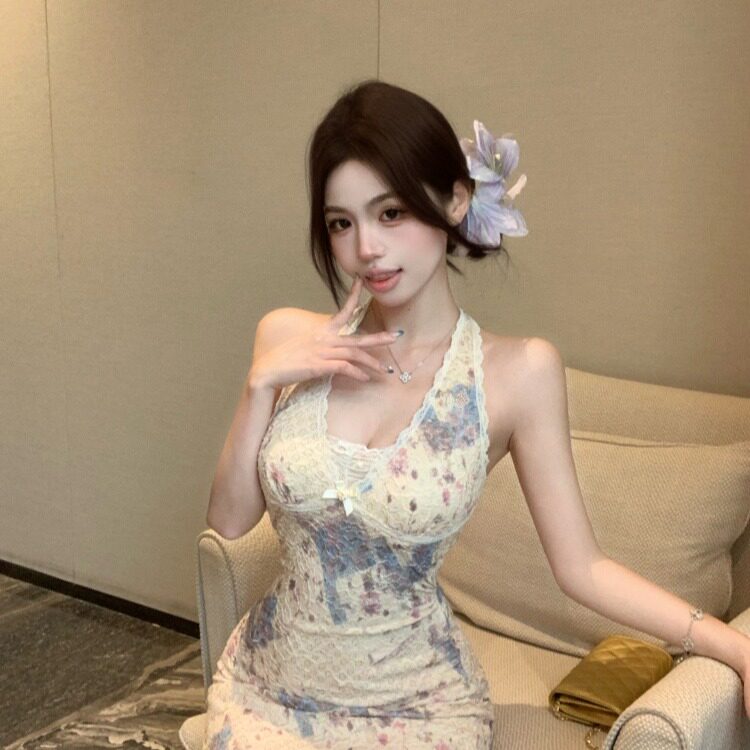 📚 夏150cm矮个子辣妹设计感挂脖露背蕾丝连衣裙短款带胸垫xxs加小码
