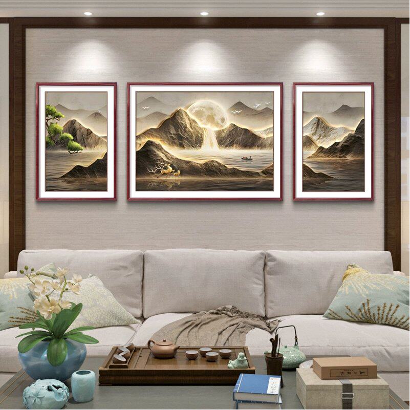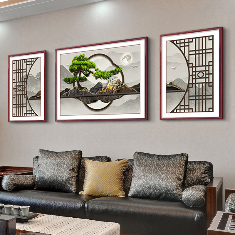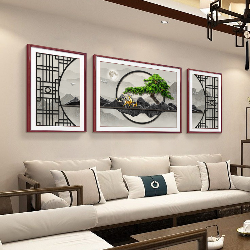 📚 迎客松客厅装饰画新中式沙发背景墙挂画山水禅意茶室横版三联壁画