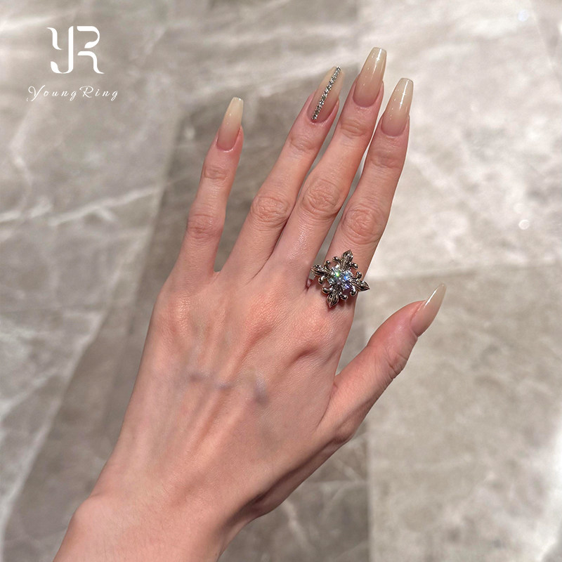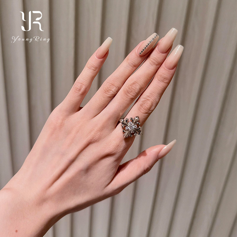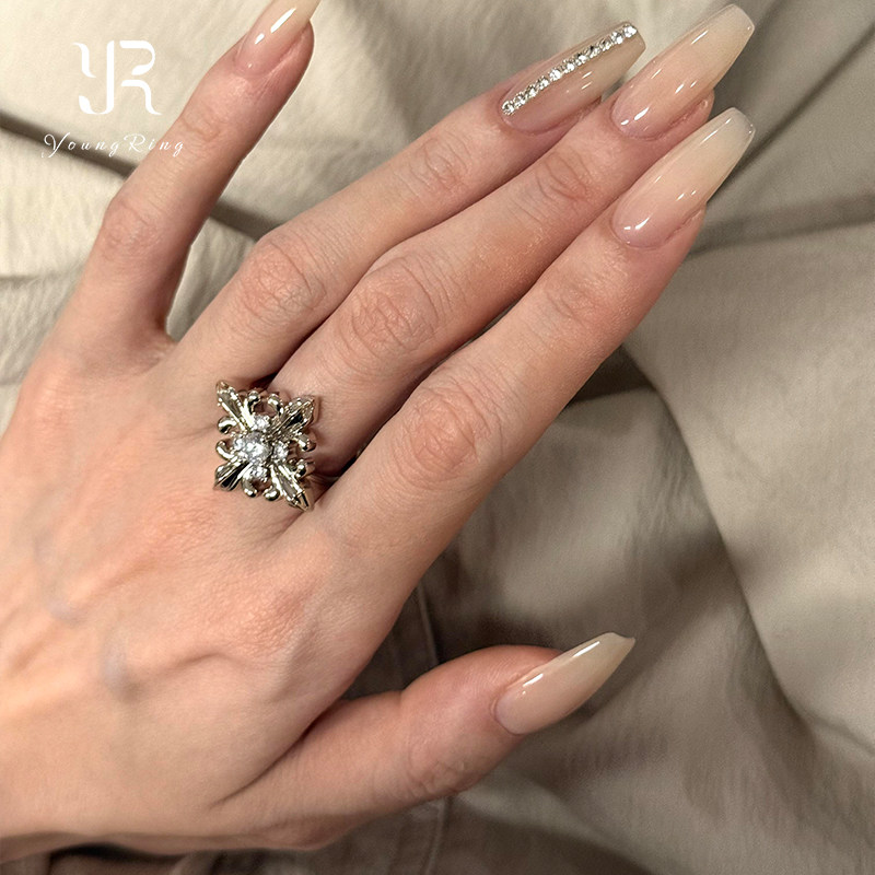 📚 中古银色爆闪鸢尾花戒指女vintage重工轻奢高级感小众食指戒指环