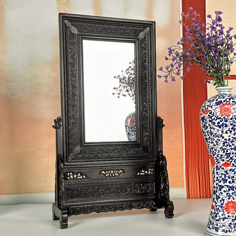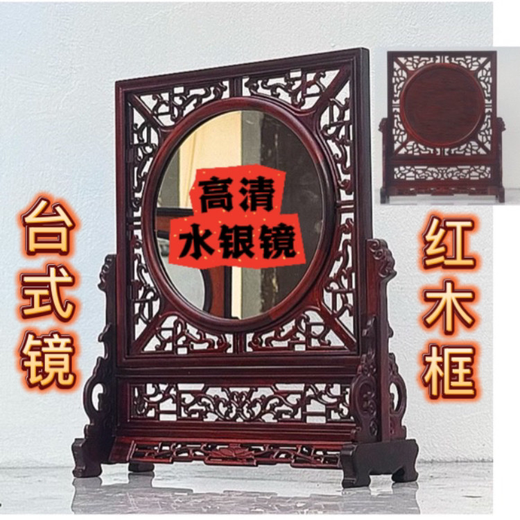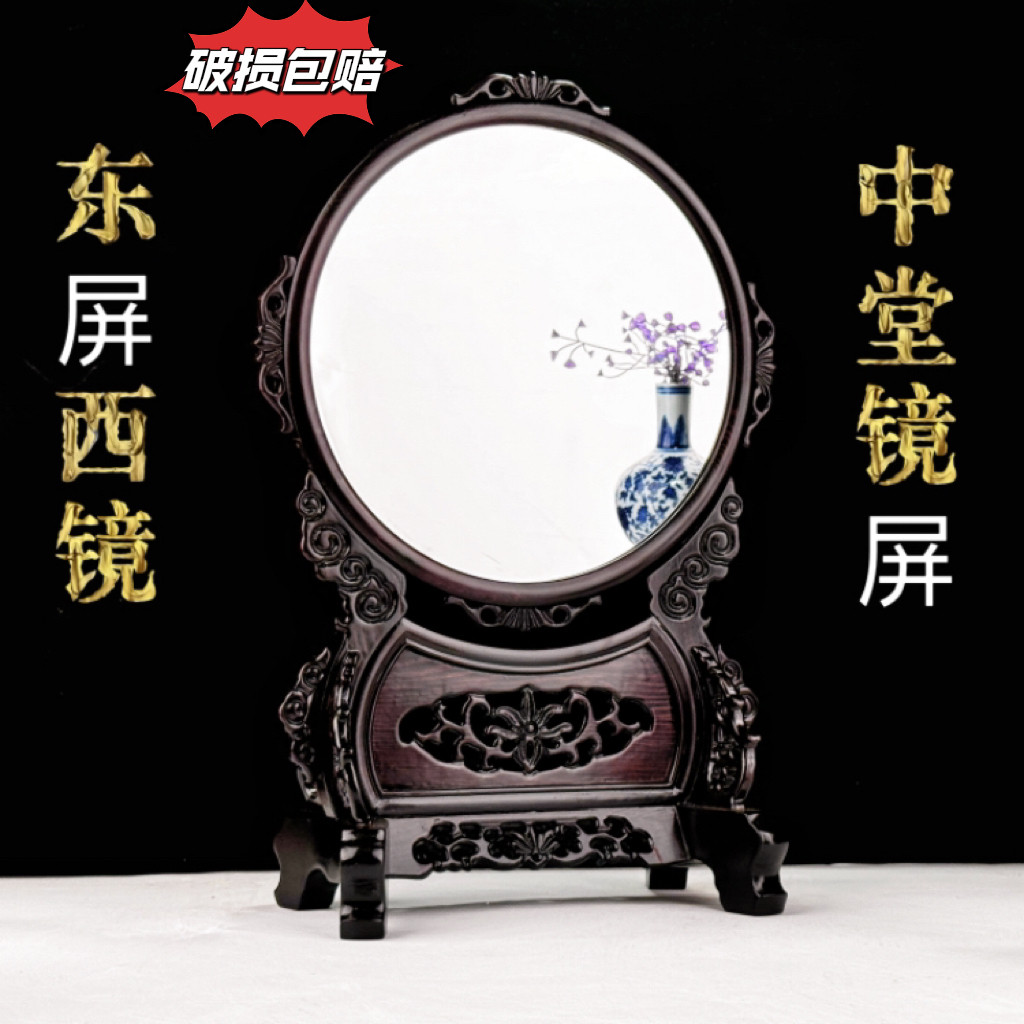 📚 化妆镜 红木雕花台屏镜东瓶西镜条案装饰摆件 红酸枝木雕中堂镜子