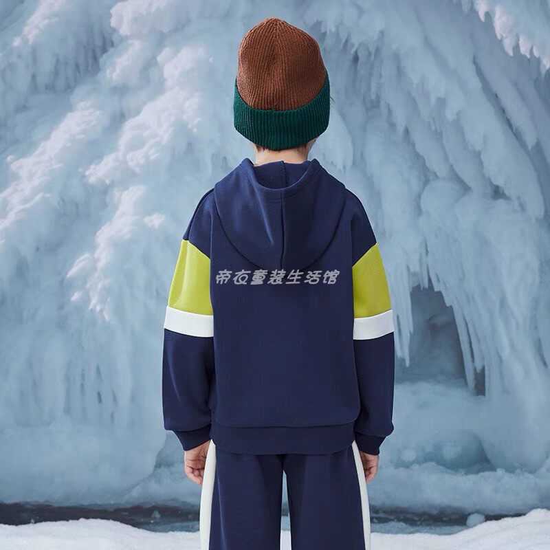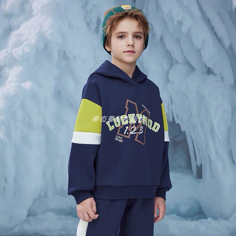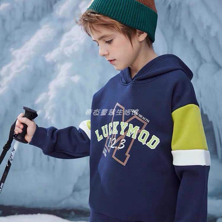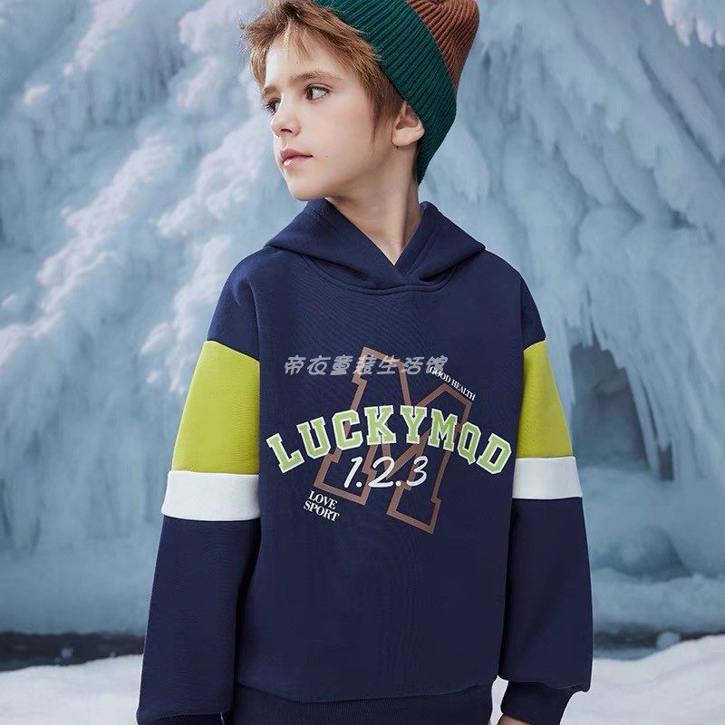 📚 马其顿男童冬季加绒连帽卫衣 拼色儿童运动休闲套头衫印花厚上衣