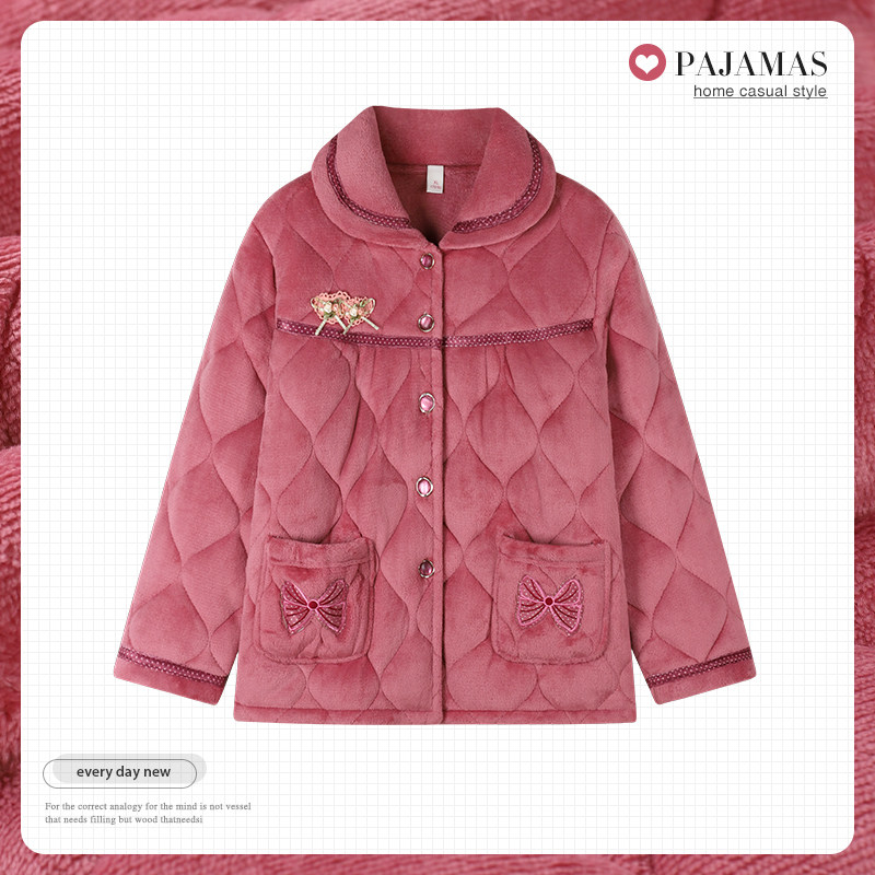 📚 中年妈妈单件上衣珊瑚绒夹棉三层加厚开衫长袖大码可外穿睡衣女款