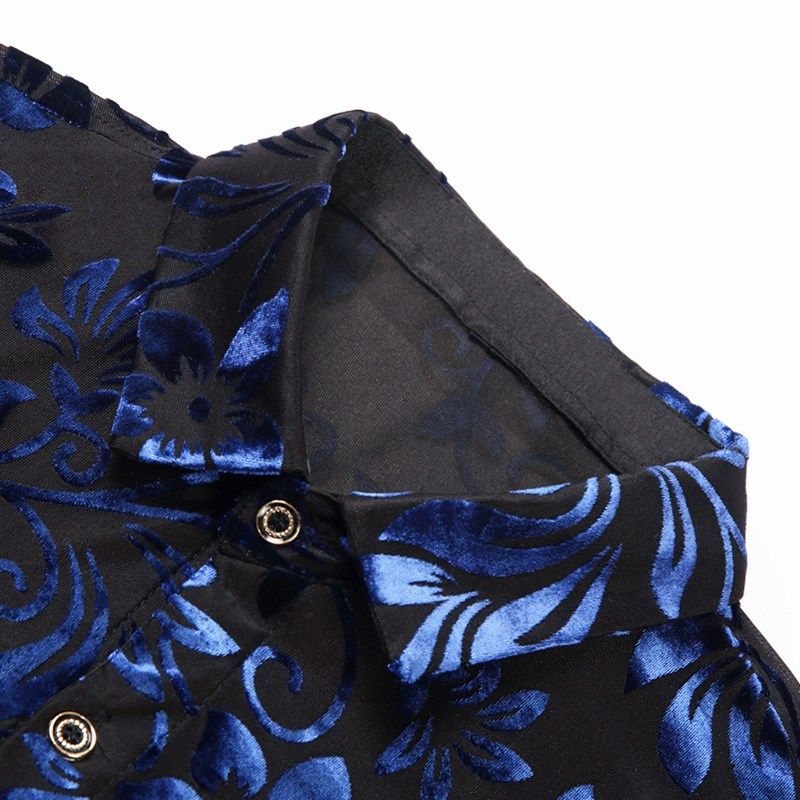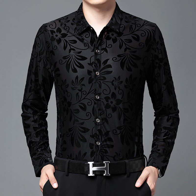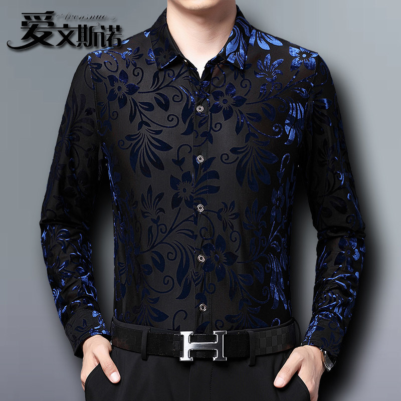 📚 秋季新款长袖衬衫男碎花镂空衬衣爸爸装半透明舞蹈服蕾丝跳舞衣服