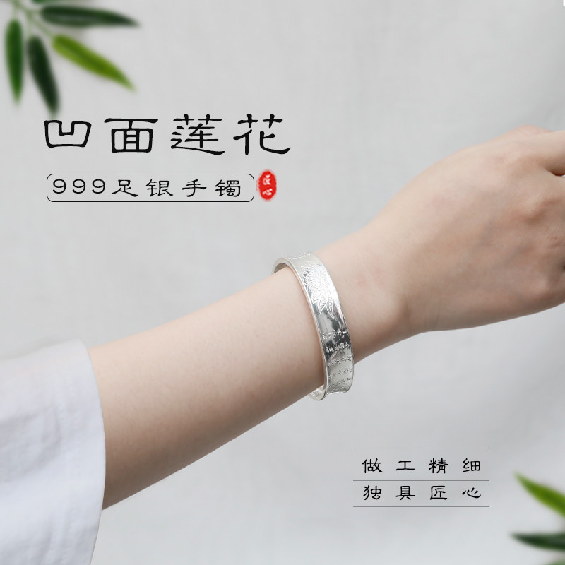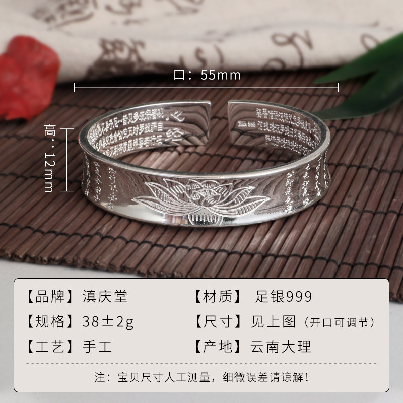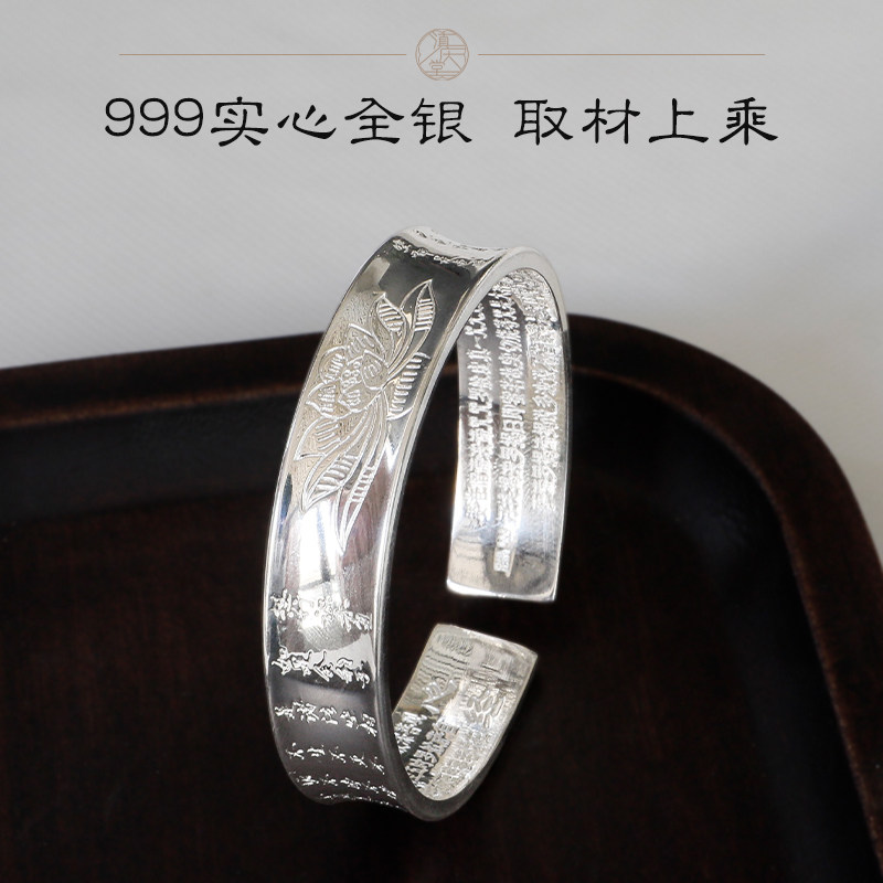 📚 莲花心经纯银手镯999足银实心开口年轻款银镯子银饰礼物正品