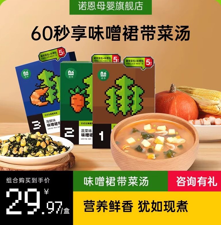 📚 诺恩裙带菜汤味噌汤儿童全家型汤料原味蔬菜味海鲜味独立盒装