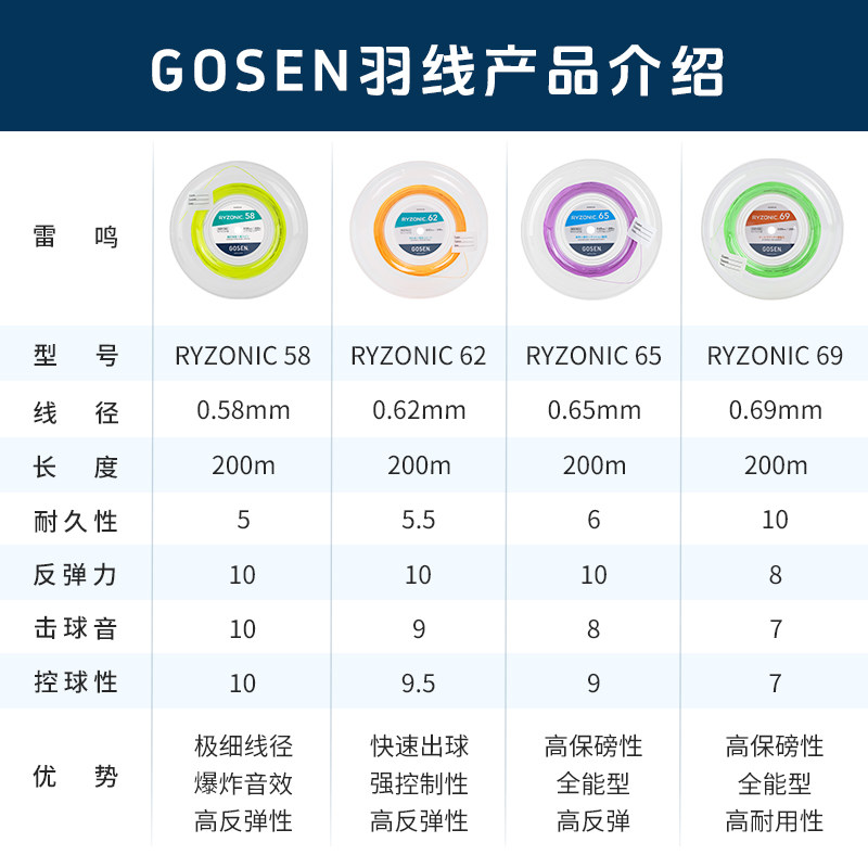 📚 GOSEN/高纤日本进口高神雷鸣69/65/62/58弹性击球音大盘羽毛球线