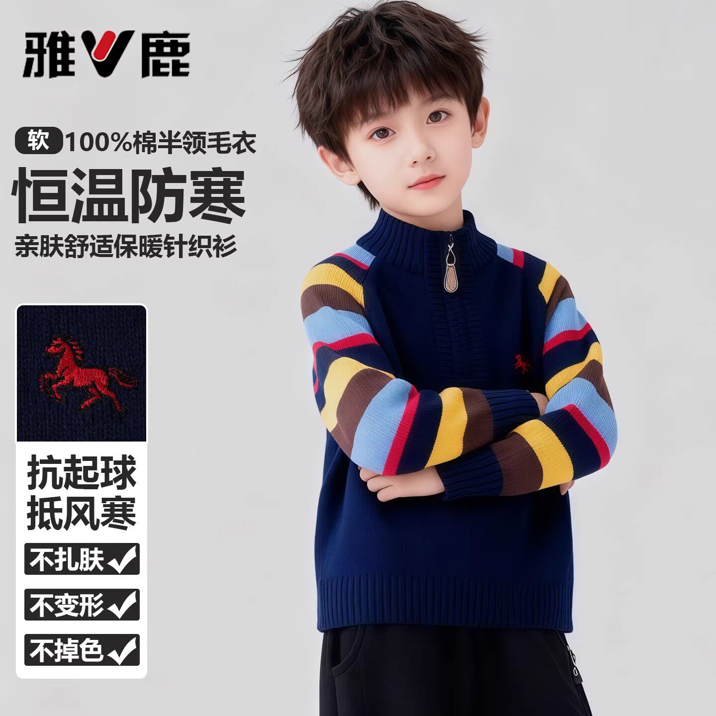 📚 雅鹿100%棉男童半高领拉链毛衣2026春款中大童男孩青少年针织外套