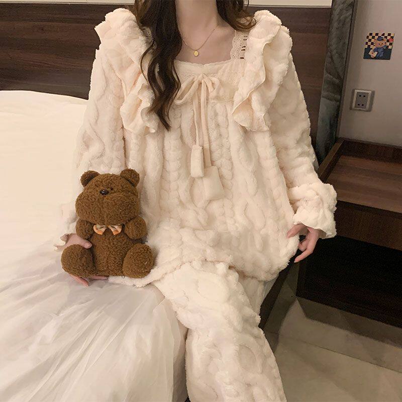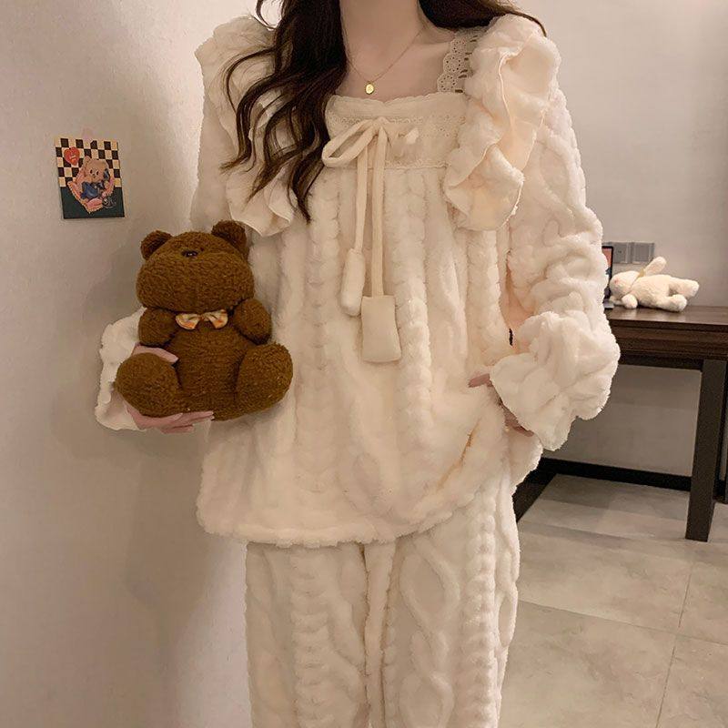📚 公主风睡衣女款秋冬季加绒加厚保暖珊瑚绒甜美可爱冬天家居服套装
