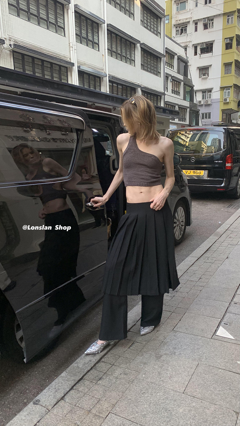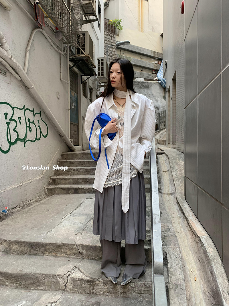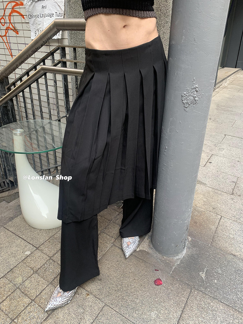 📚 LONSLAN 小众设计宽松叠穿阔腿拖地假两件西装百褶裙半身裙长裙女