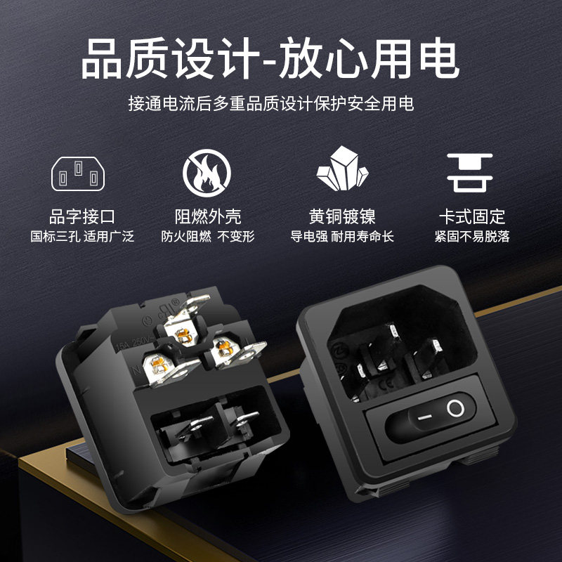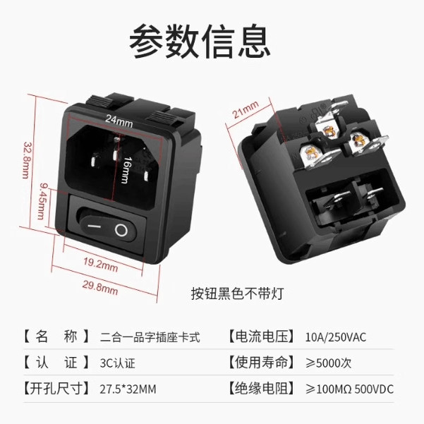 📚 嵌入式卡式ac品字插座电源插座带黑色2脚小开关卡扣三孔10a250v