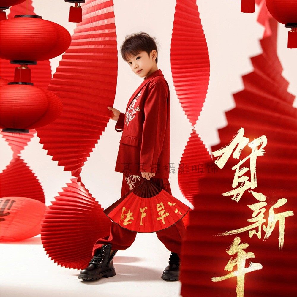 📚 红色新年男孩中式礼服套装中国风喜庆写真摄影主题模卡走秀演出服