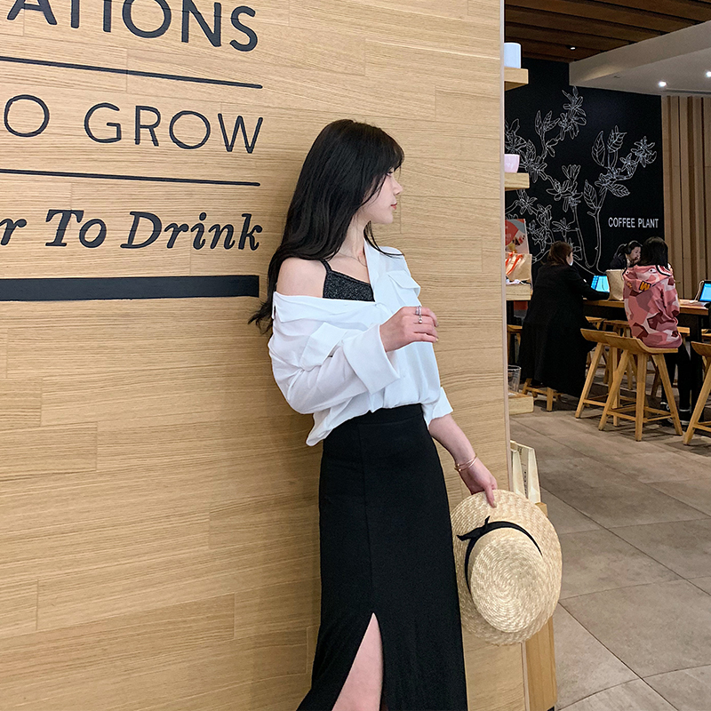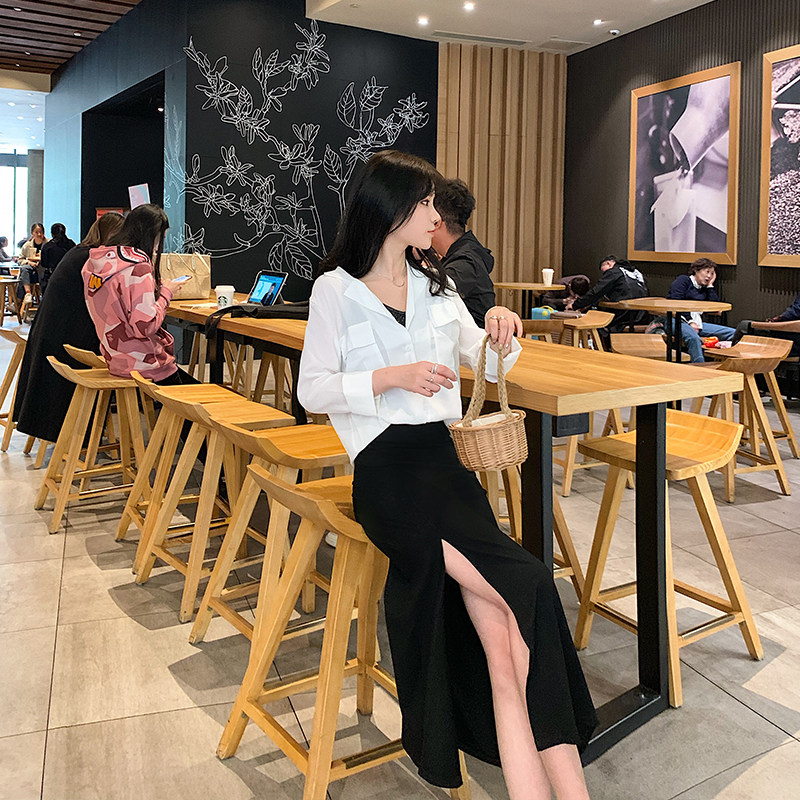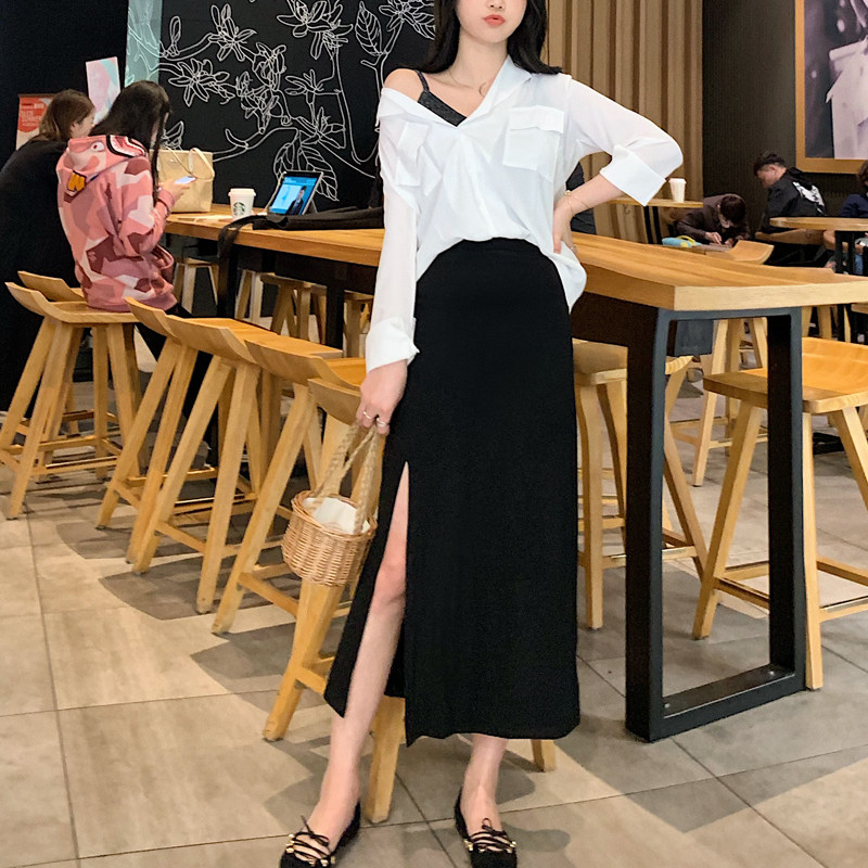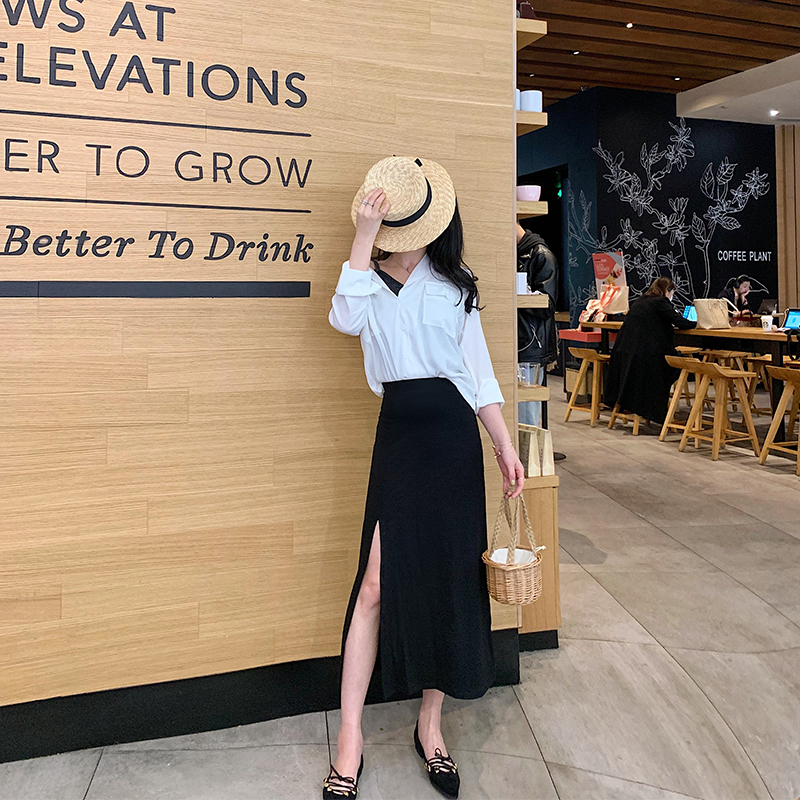 📚 春夏新款韩版优雅简约莫代尔纯色高腰前侧开叉大摆半身裙长裙女潮