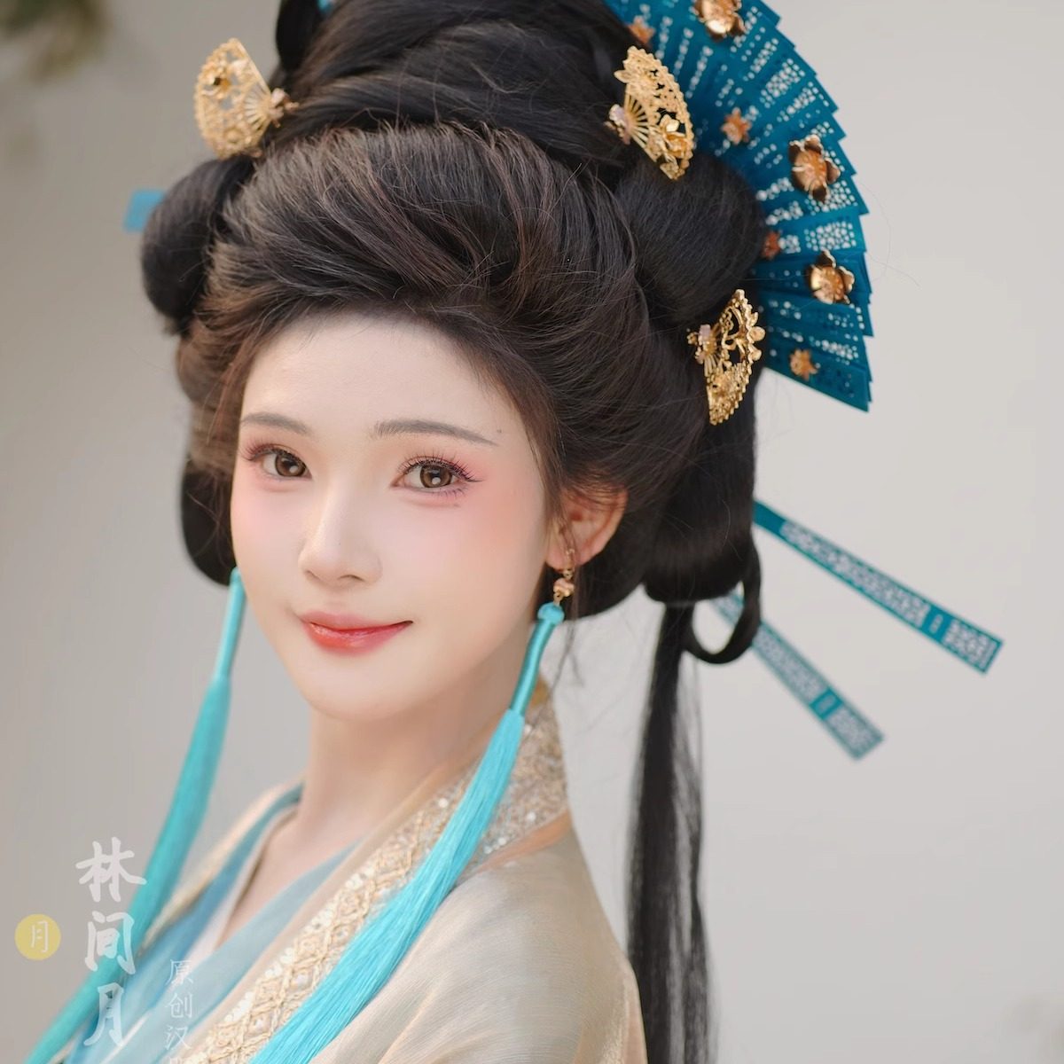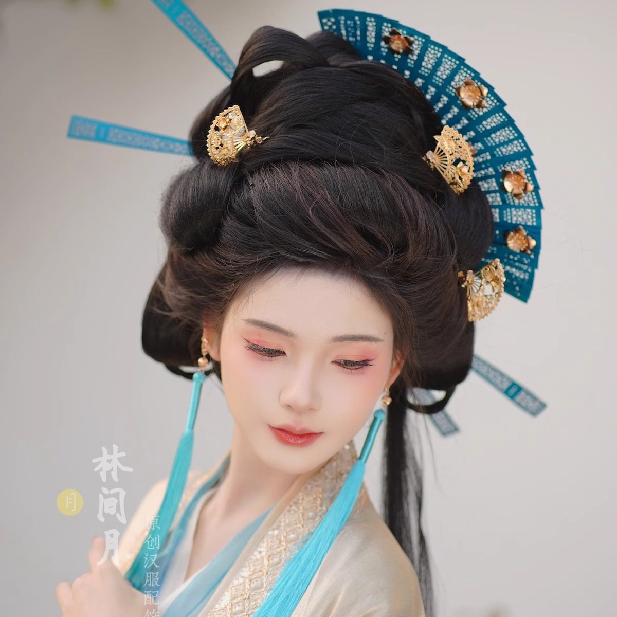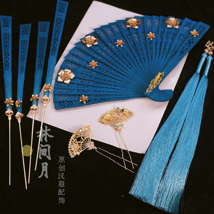📚 林间月原创【蓝屏雀】蓝色玄女扇子发冠套装流苏发饰发簪汉服配饰