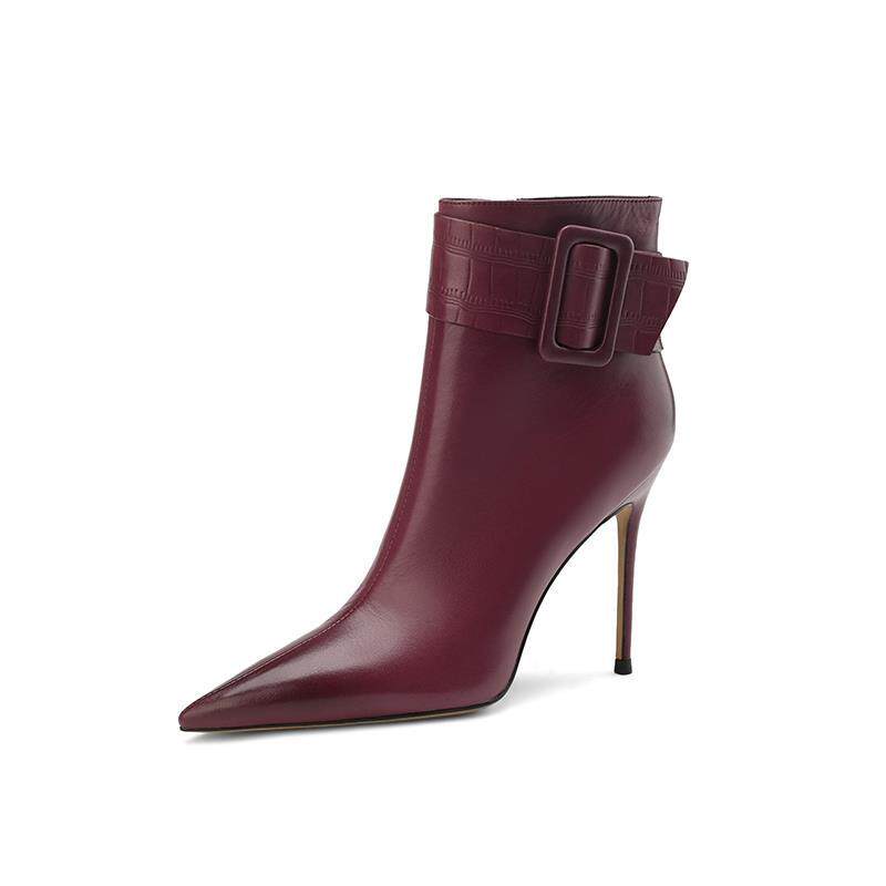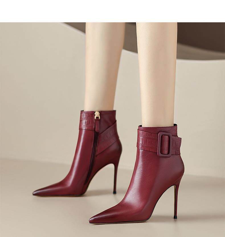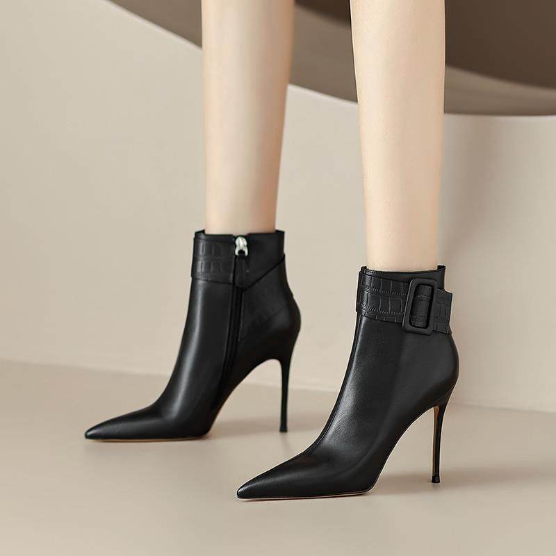 📚 黑色皮面短靴女2022年新款秋冬季尖头细跟高跟鞋皮带扣气质女靴