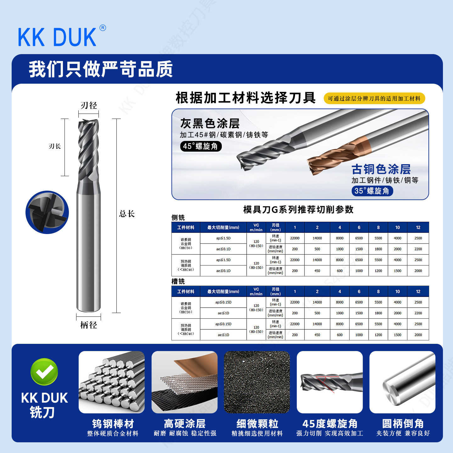 📚 KK DUK高品质钨钢涂层立铣刀模具钢件专用平底刀1.0 1.5 2.0-20.0