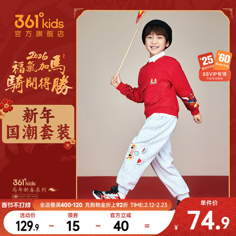 📚 361度童装男童加绒加厚儿童长裤2026春新年小童红色卫衣运动裤子