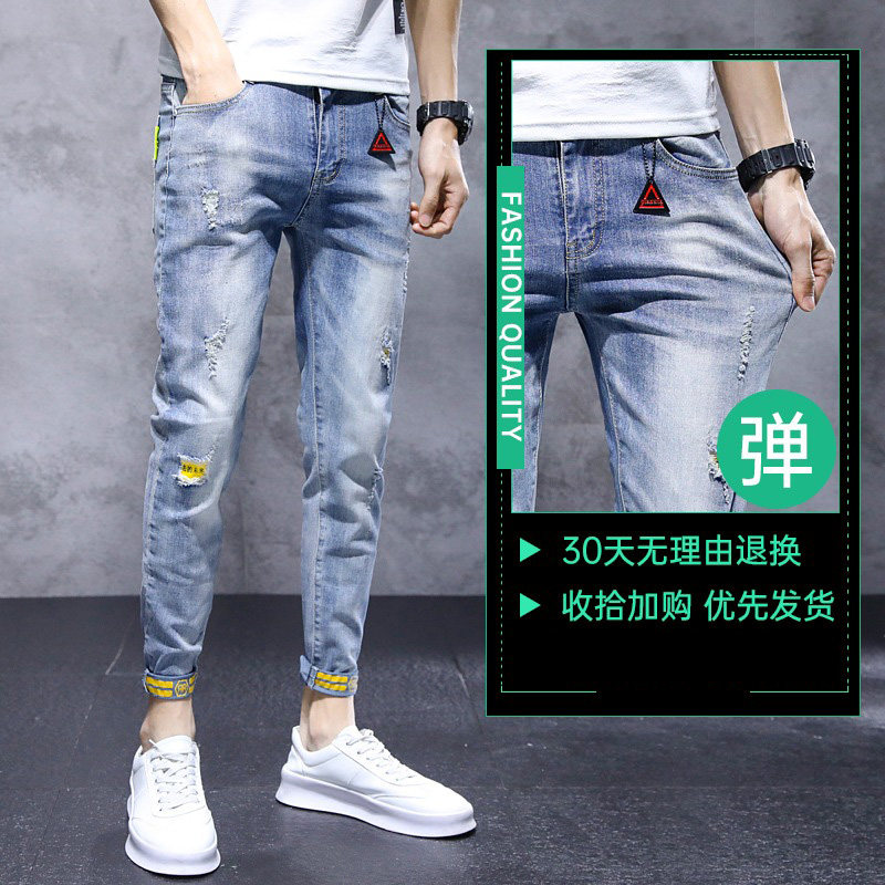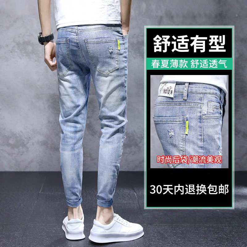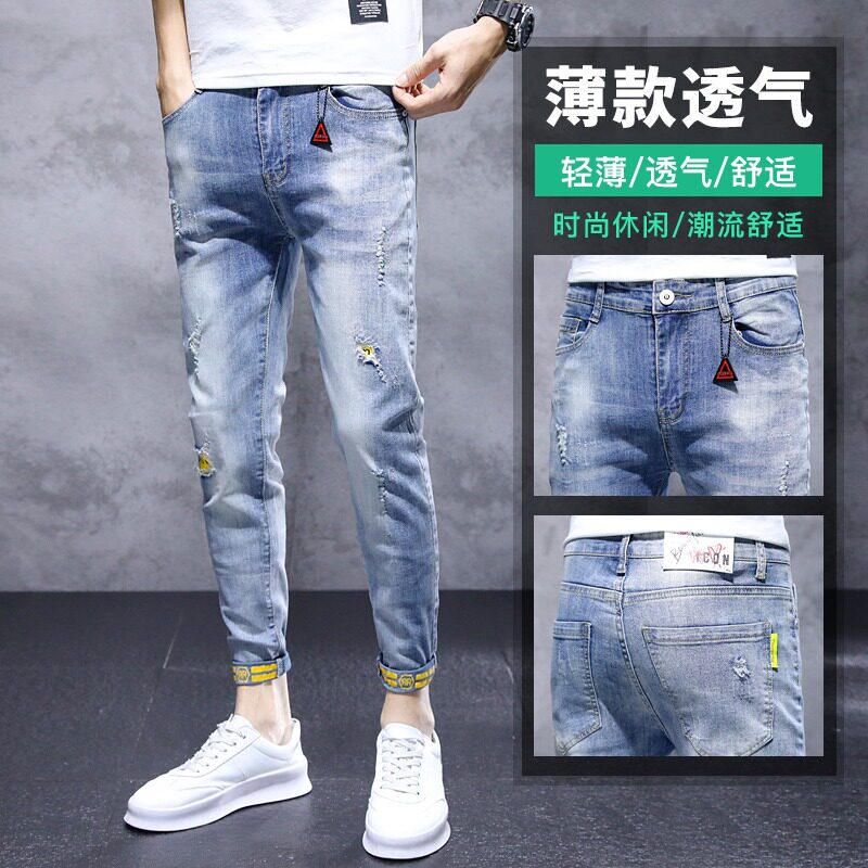 📚 牛仔裤男士夏季薄款2026新款九分破洞小脚弹力款修身韩版休闲男裤
