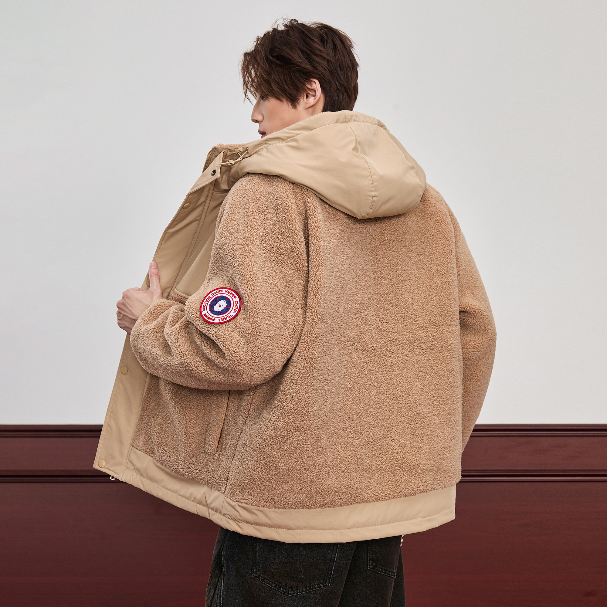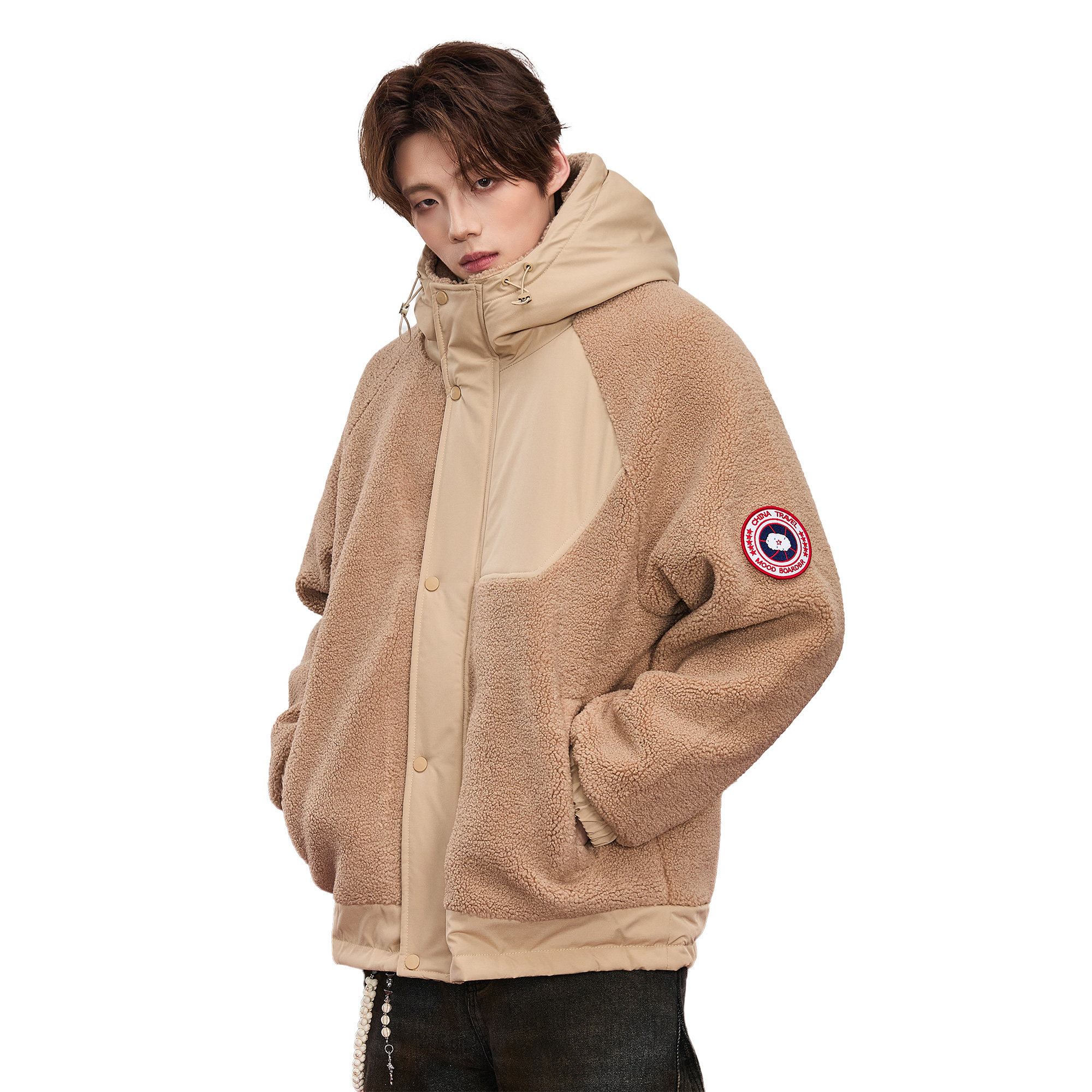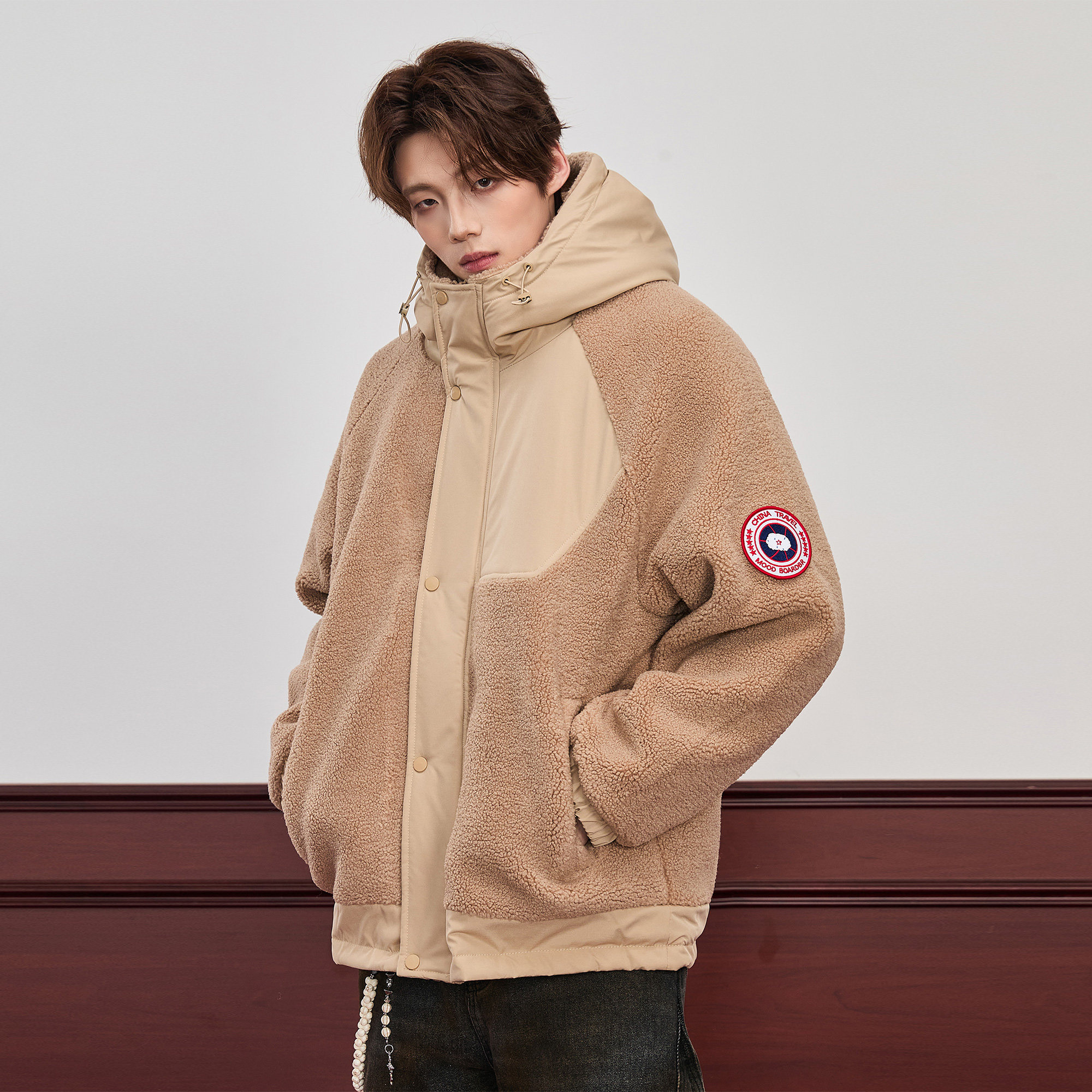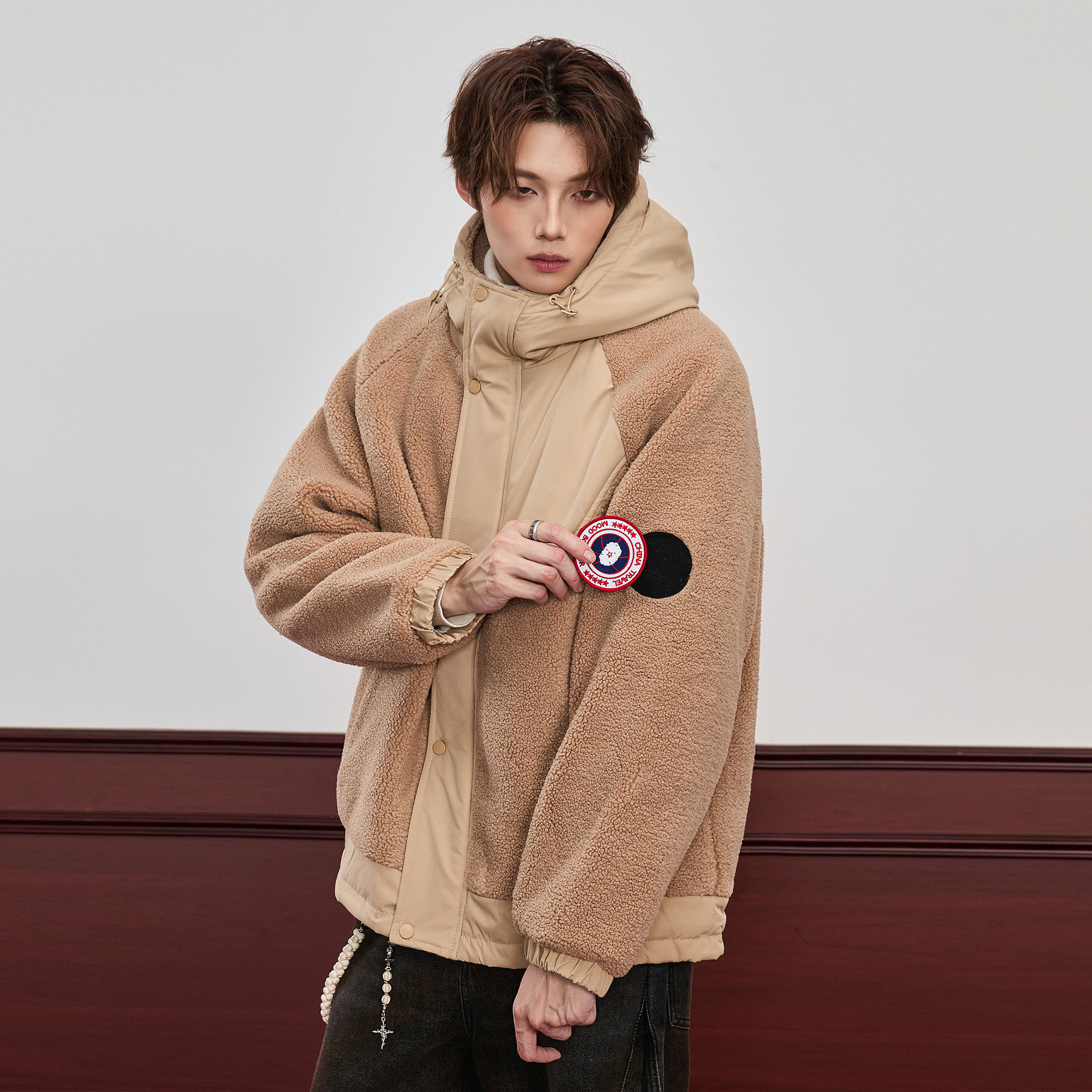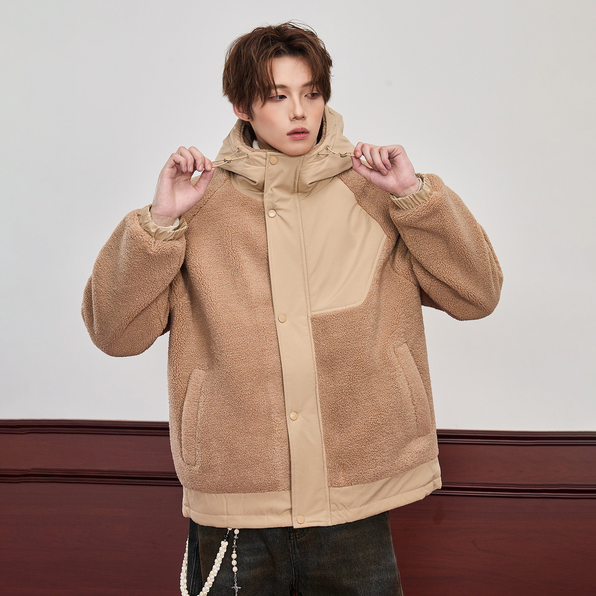 📚 ALLIN 连帽羊羔毛外套男生秋冬季潮牌颗粒绒拼接加厚棉衣情侣夹克