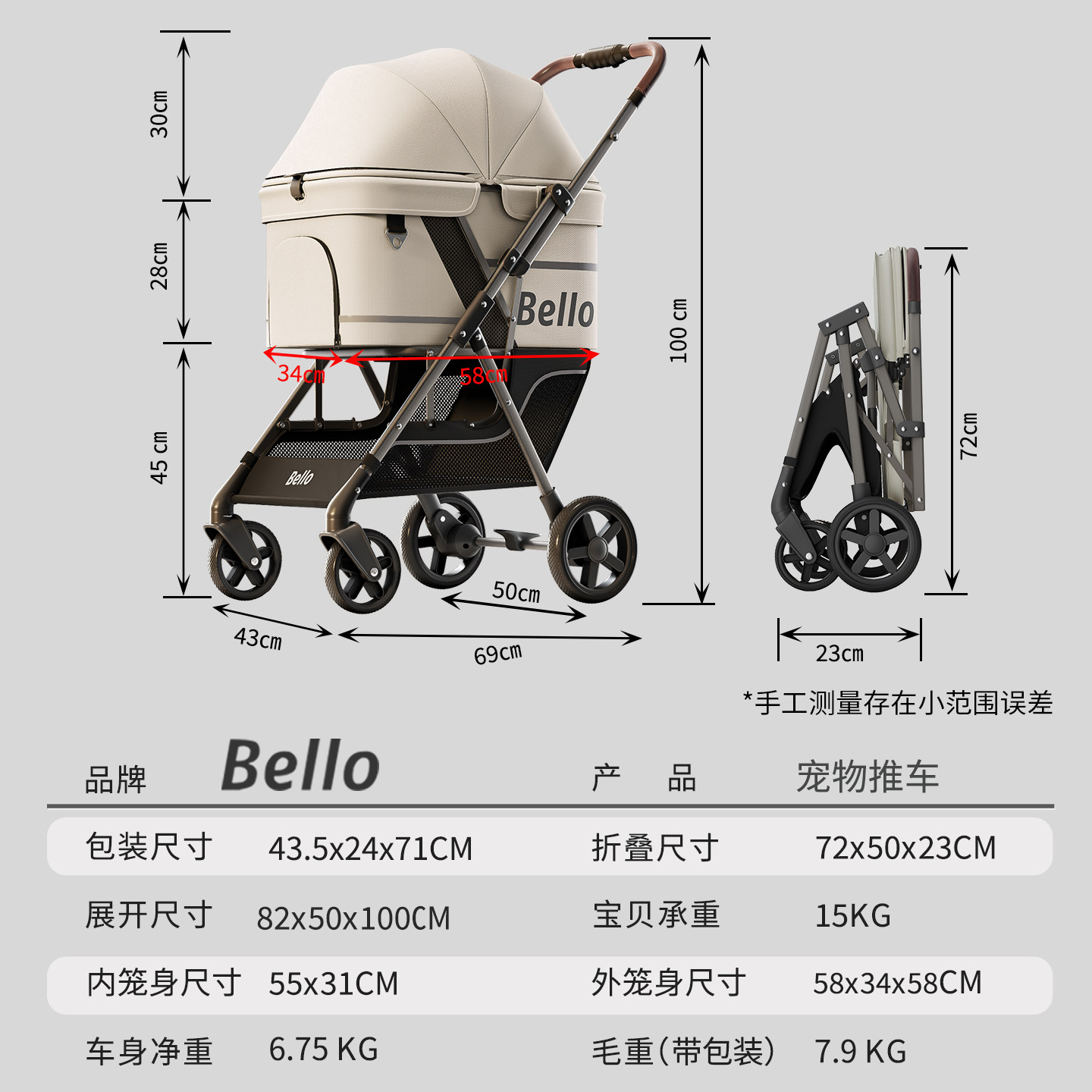 📚 bello D2宠物推车狗狗猫咪外出小推车轻便外出小拉车遛狗一键折叠