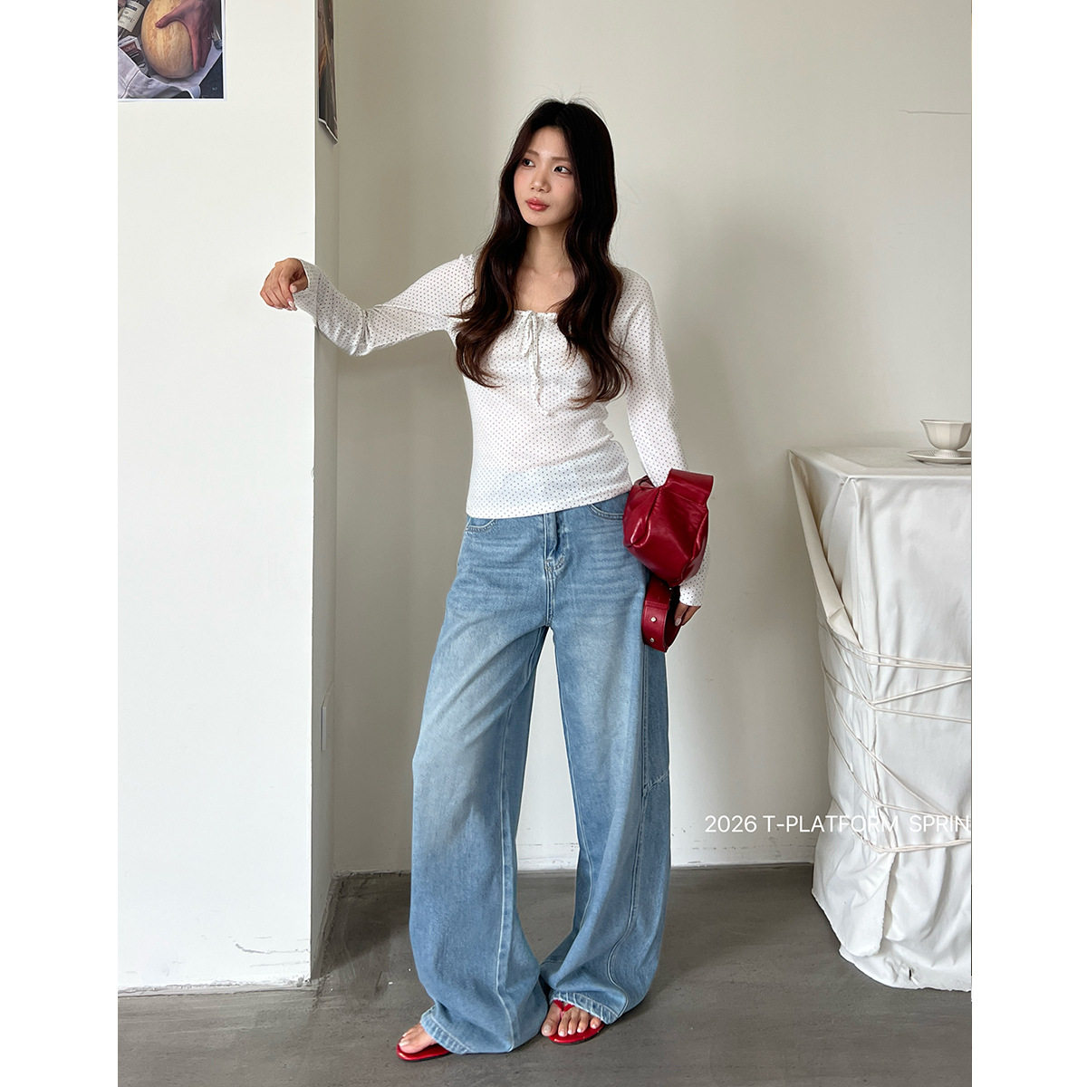 📚 T-PLATFORM 早春新款遮肉显瘦宽松长裤高腰百搭水洗蓝牛仔裤68123