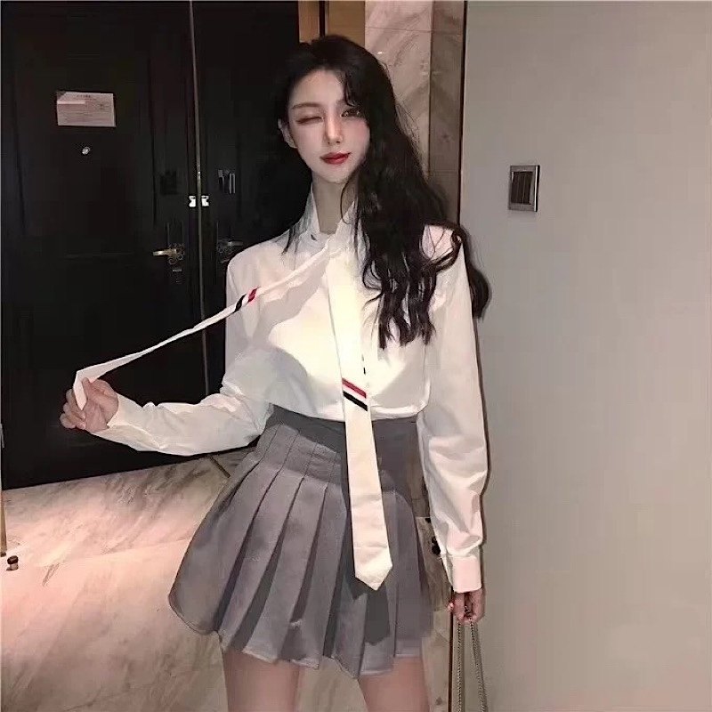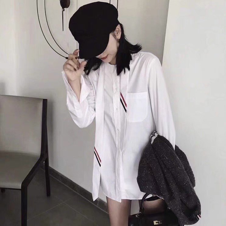 📚 TB领带衬衫女装饰白色牛津纺棉长袖红白蓝织带休闲英伦OL气质衬衣