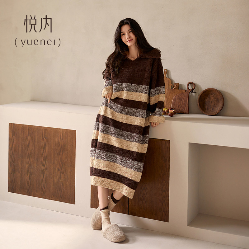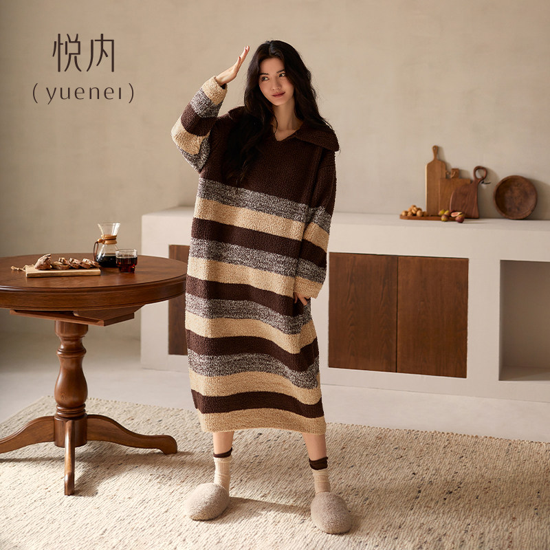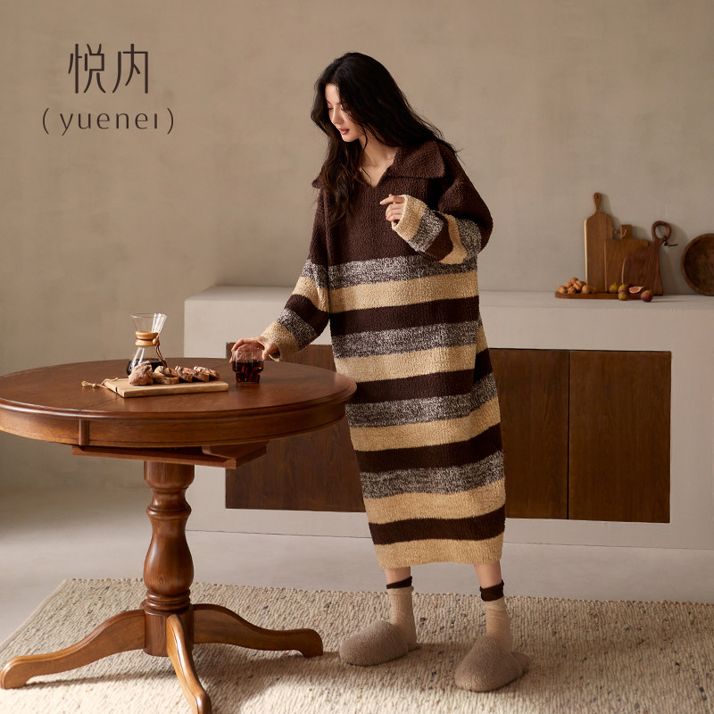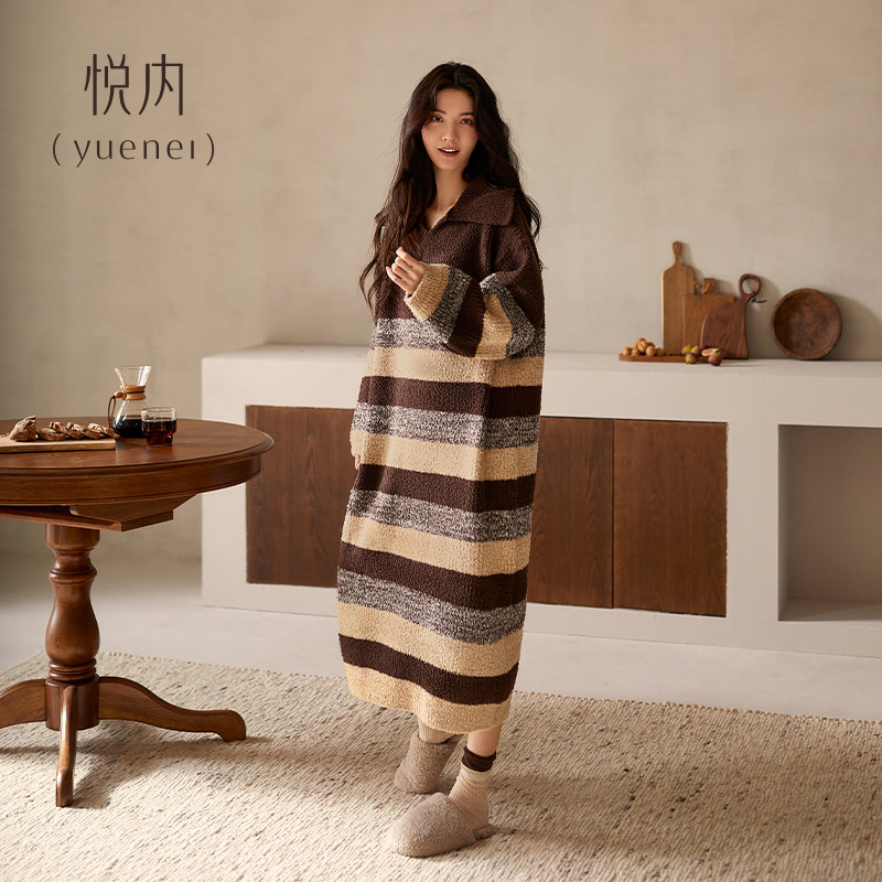 📚 悦内半边绒睡裙女款睡衣秋冬季加绒加厚珊瑚绒保暖加大码长款条纹