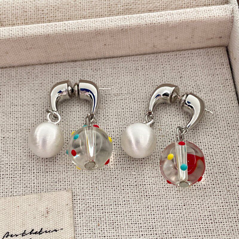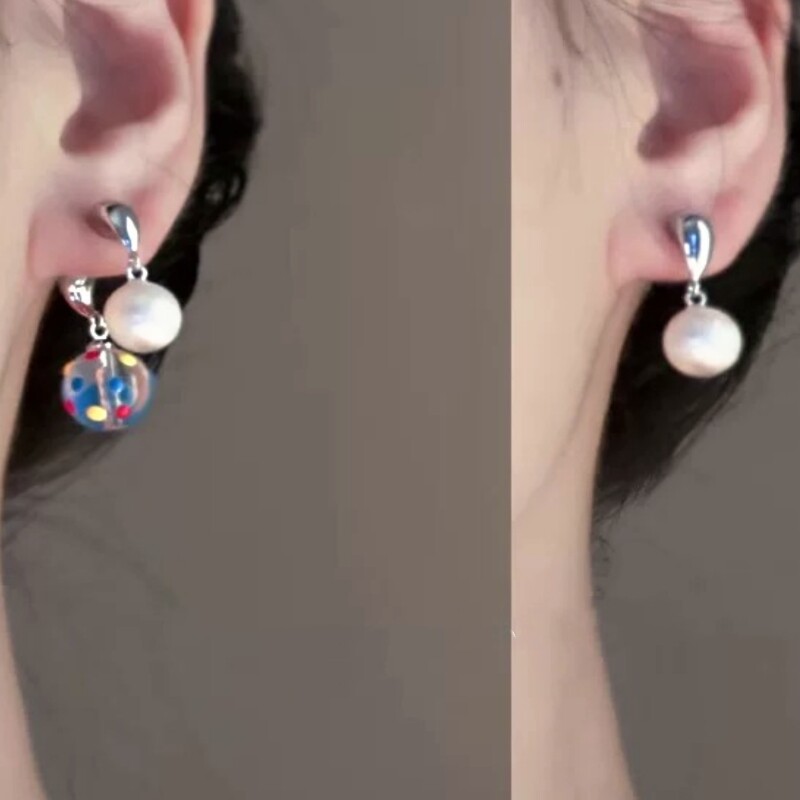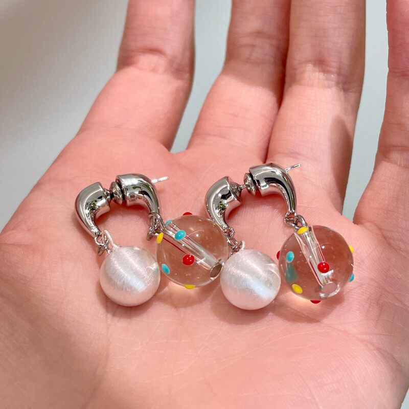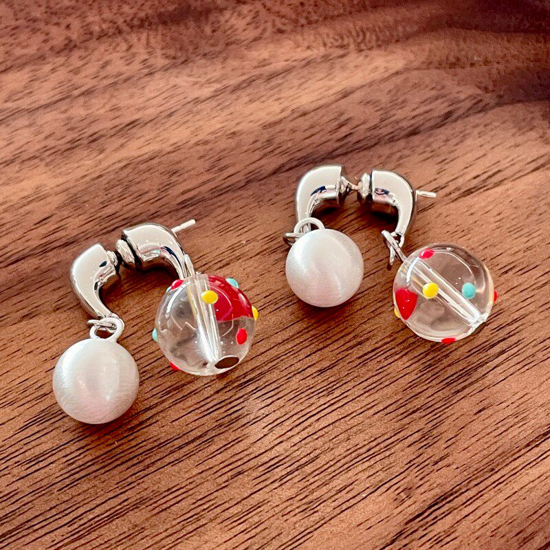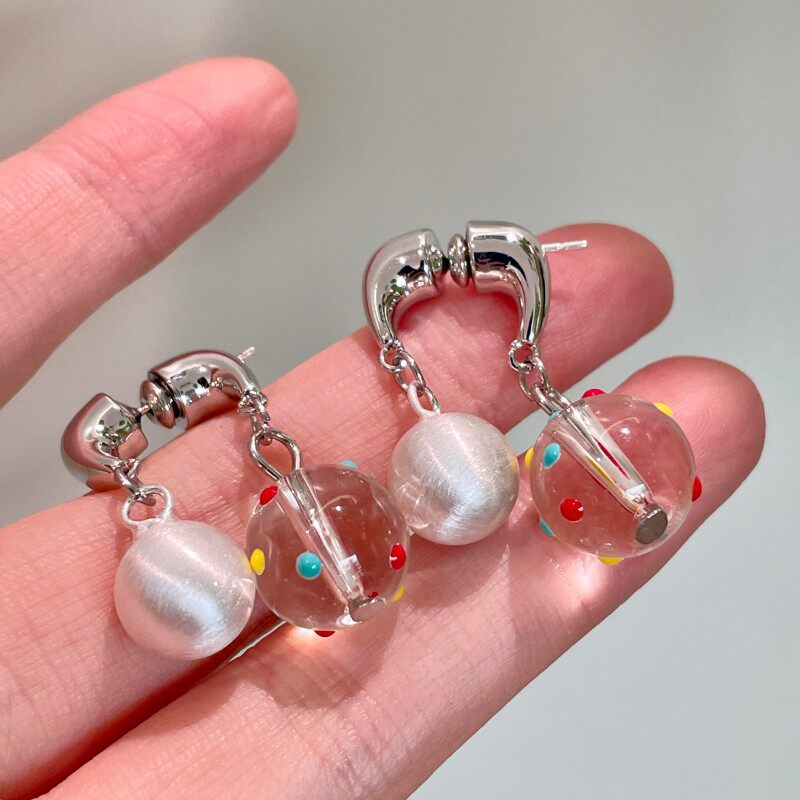 📚 彩色波点拉丝银球前后多戴法冰透琉璃珠耳钉甜美多巴胺耳环女耳饰