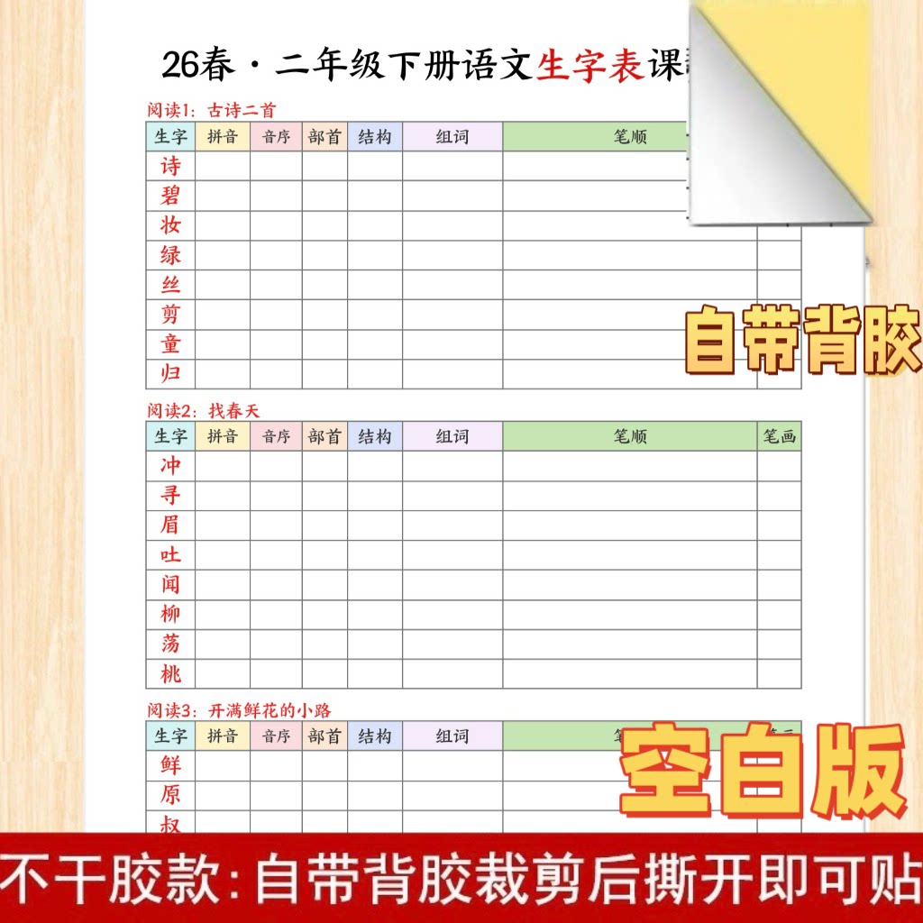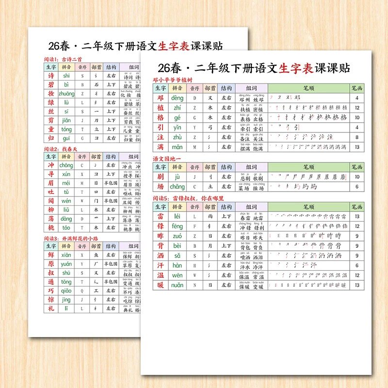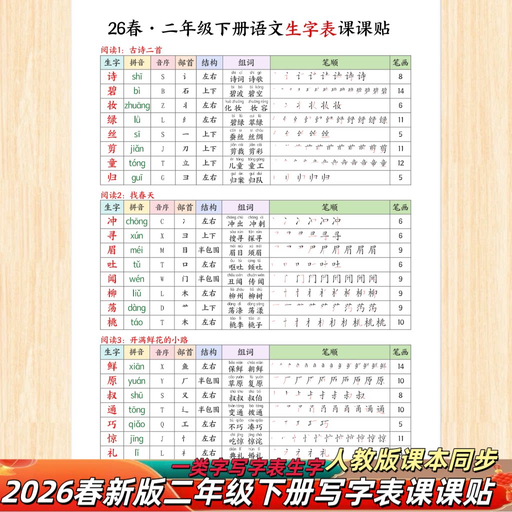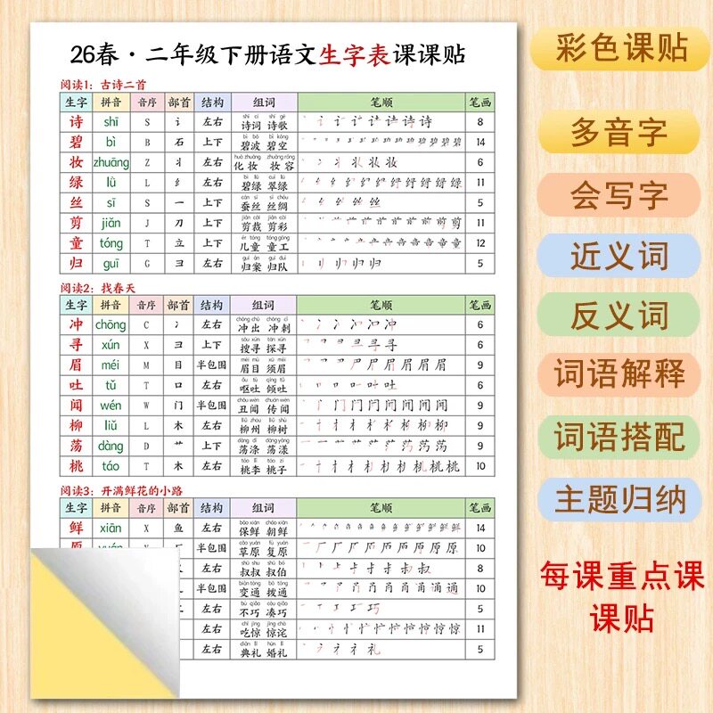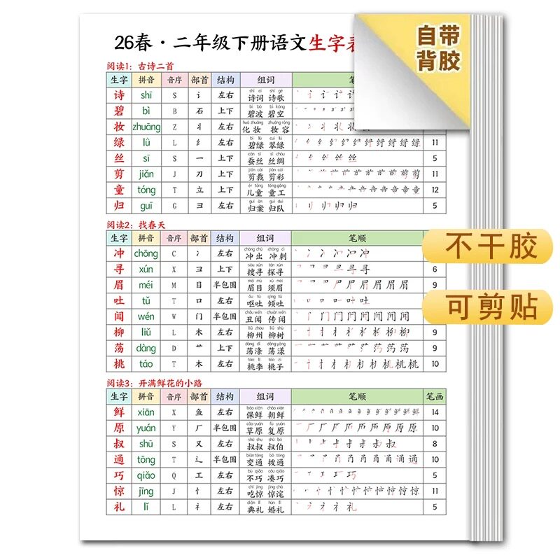 📚 新版人教版1-3年级下册小学生写字表生字课课贴课本同步拼音组词