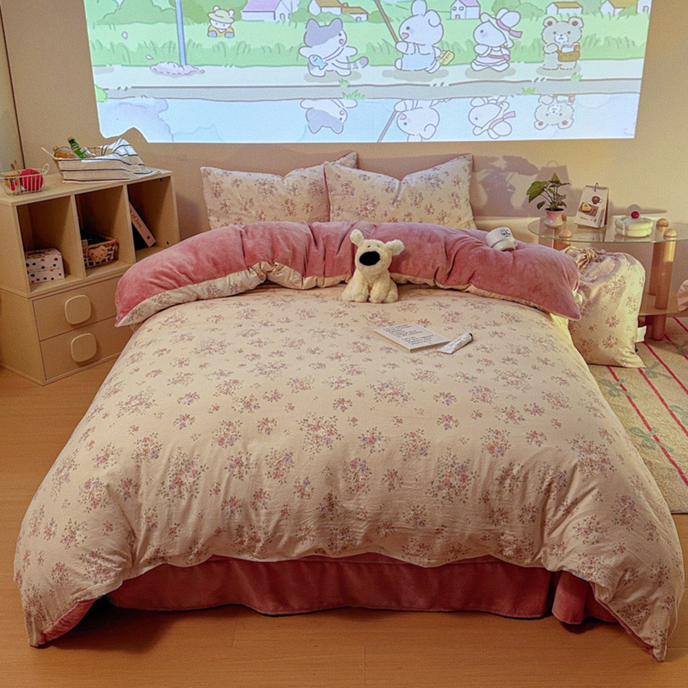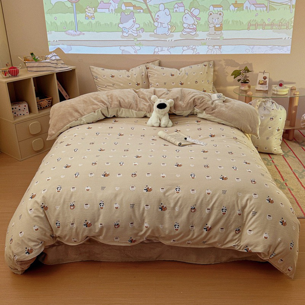 📚 韩系印花双面设计 古法水洗棉+软fufu牛奶绒保暖4件套(含小布袋)