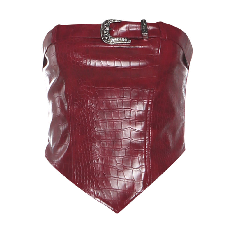 📚 怪诞女孩 辣妹风复古鳄鱼纹PU皮抹胸上衣腰带设计感修身短裤套装