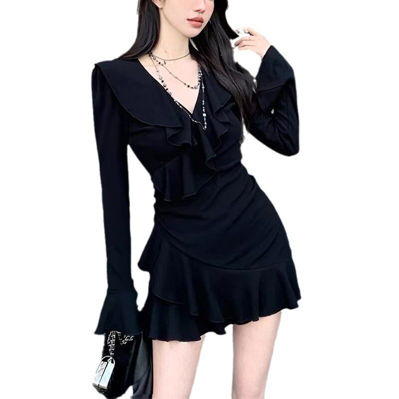 📚 设计感荷叶边V领连衣裙女秋冬新款气质修身显瘦收腰a字包臀短裙子