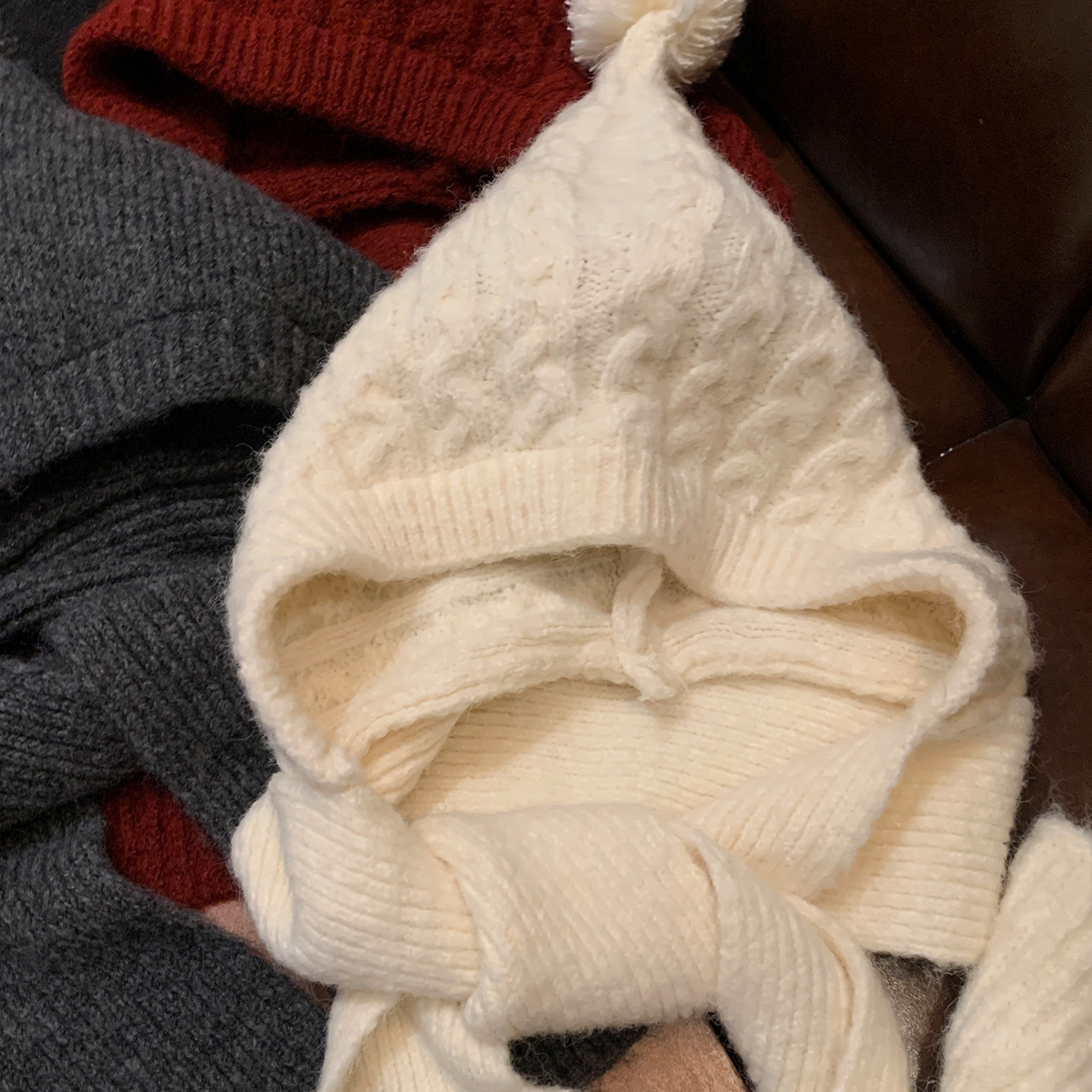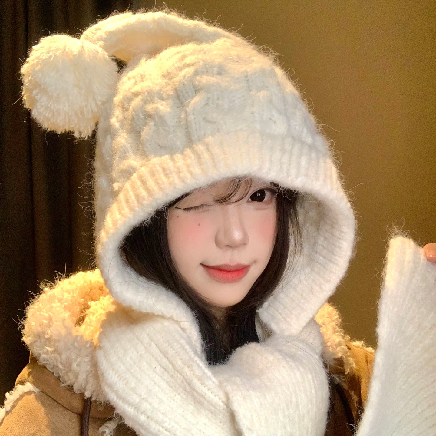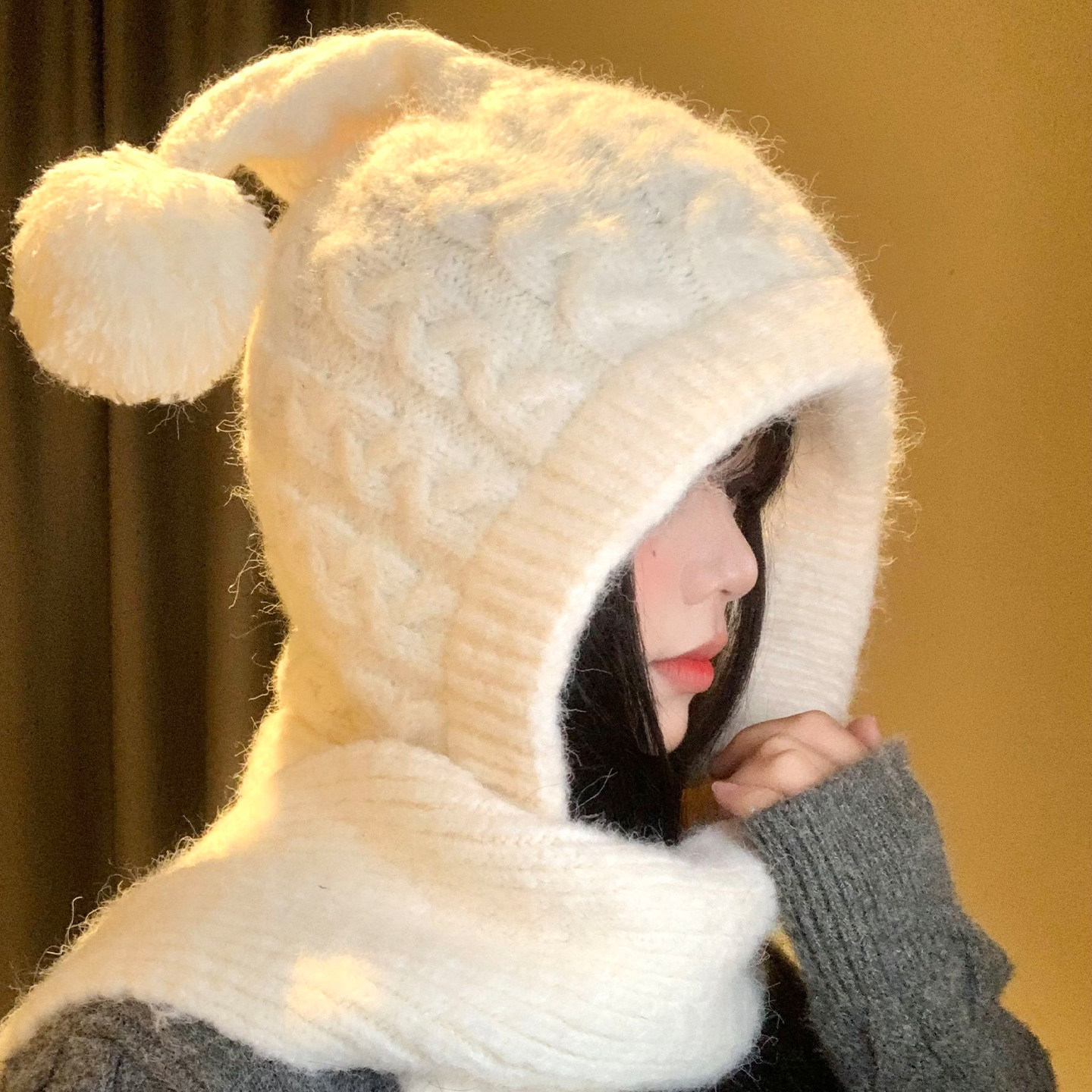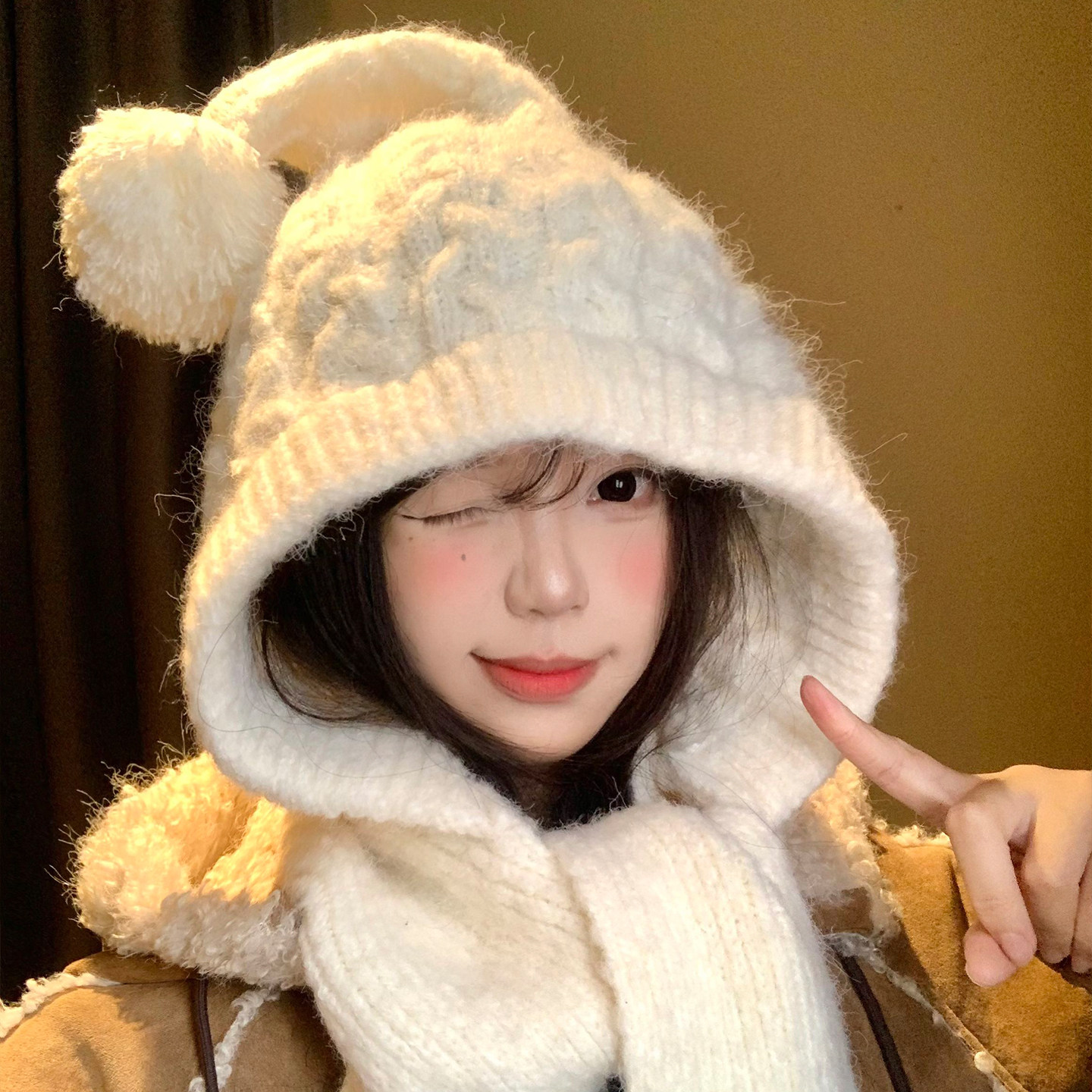 📚 可爱毛球麻花针织帽子围巾一体女冬季显脸小保暖防寒护耳毛线帽子