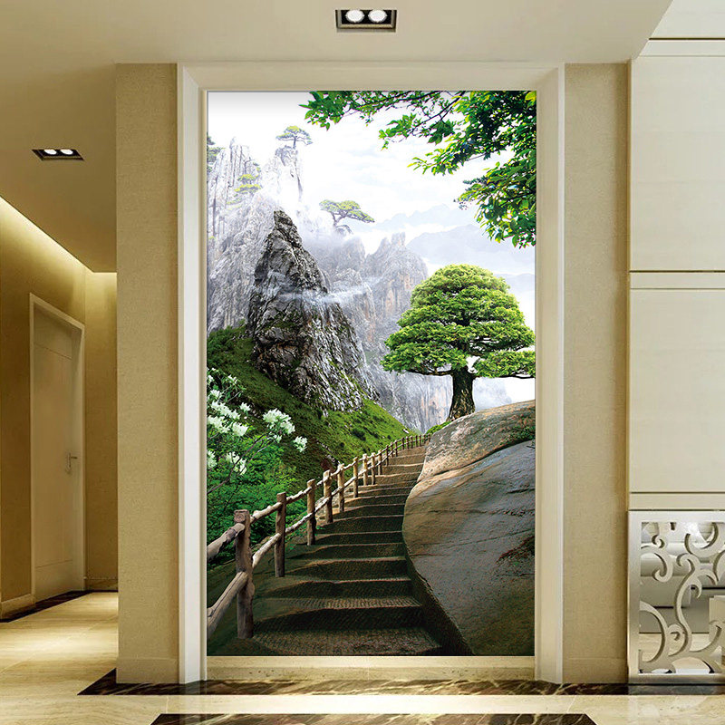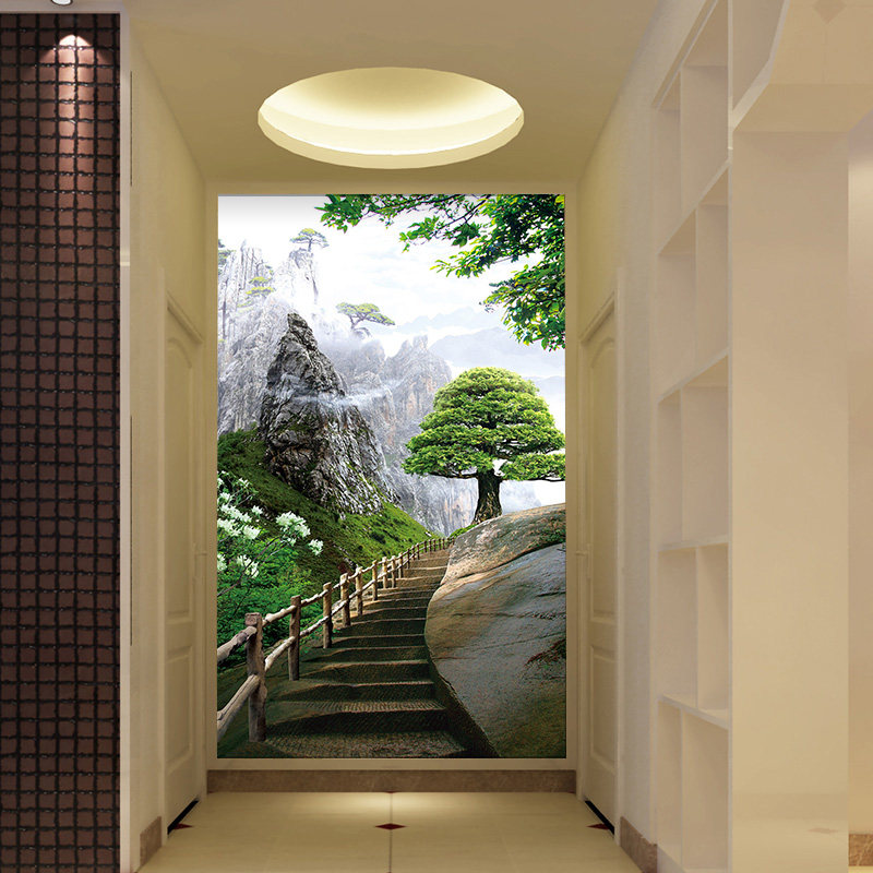 📚 精选8D立体玄关过道走 廊黄山风景画迎客松小道定制背景墙纸壁纸