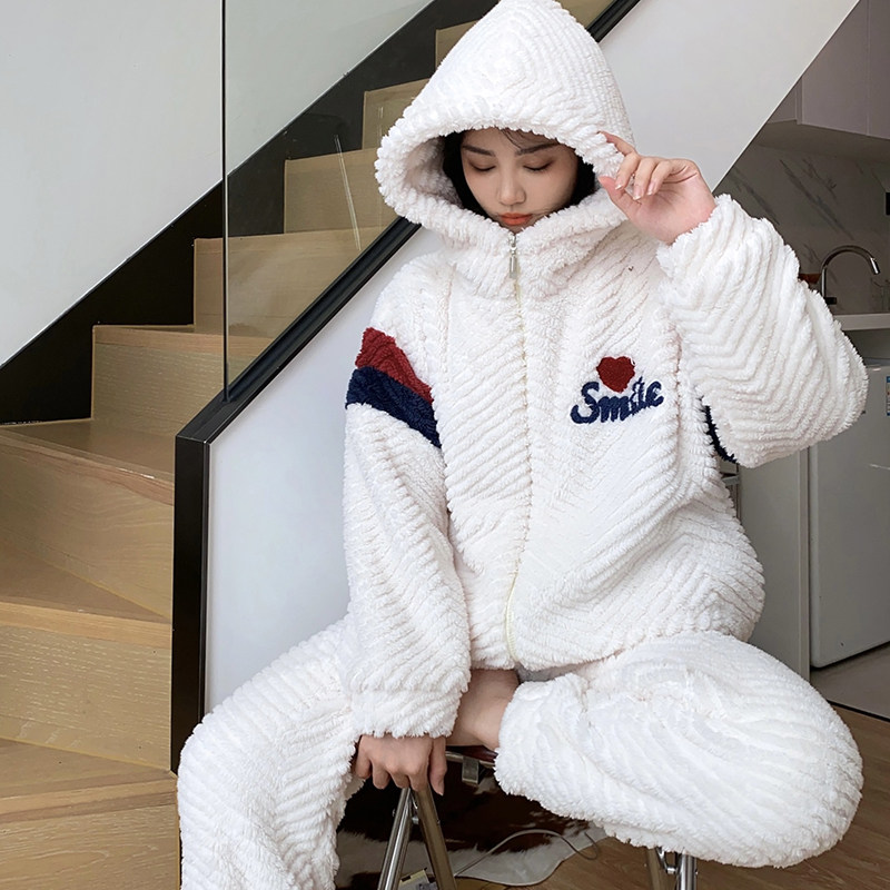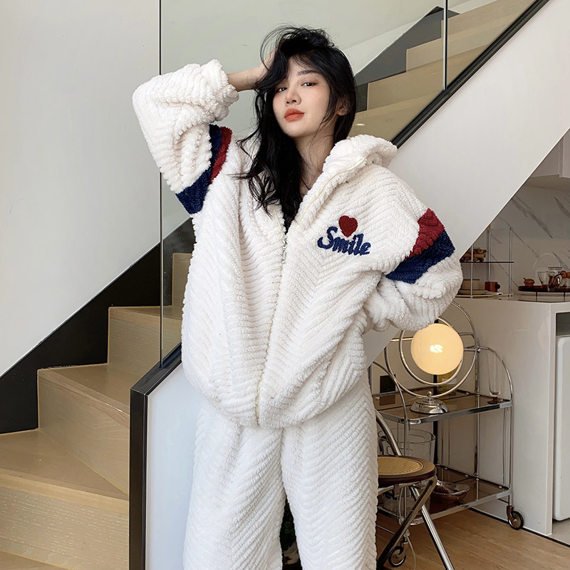📚 150娇小个子冬季加厚玫瑰绒睡衣女休闲拉链保暖连帽家居服套装xs