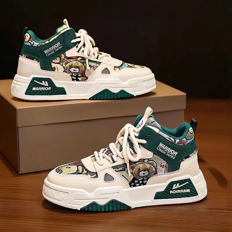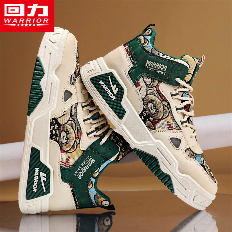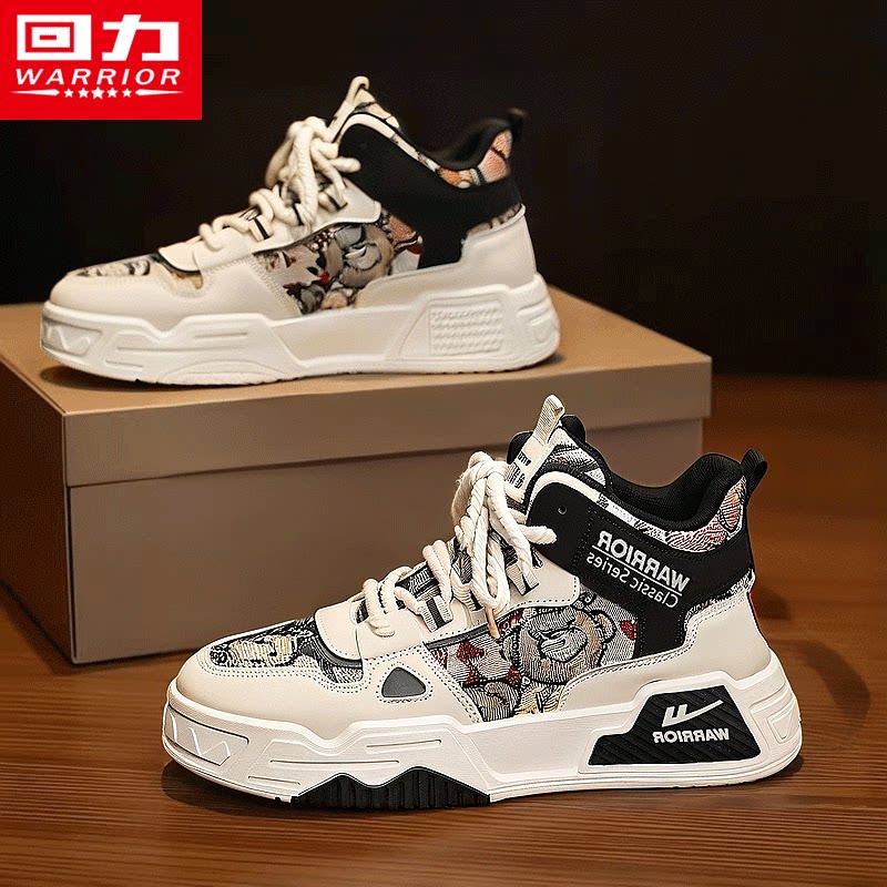📚 回力卡通小熊图案高帮板鞋春季情侣百搭厚底帆布板鞋增高休闲潮鞋