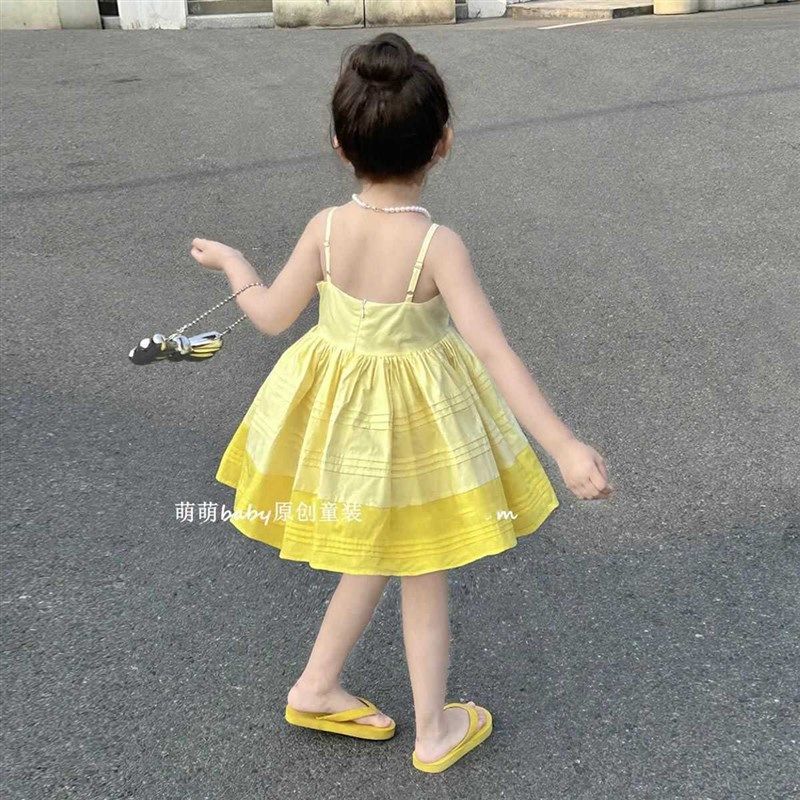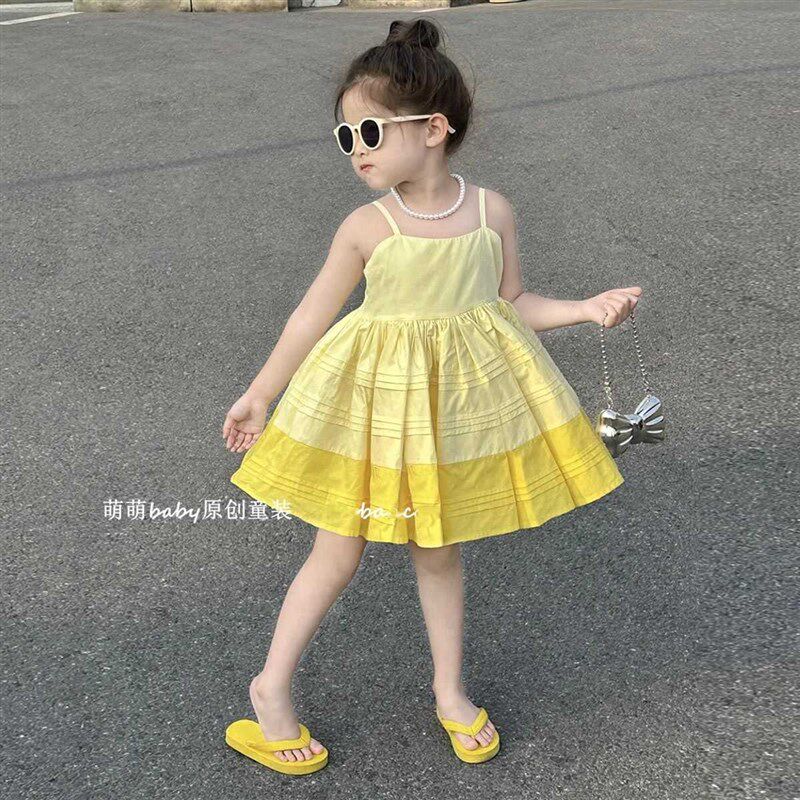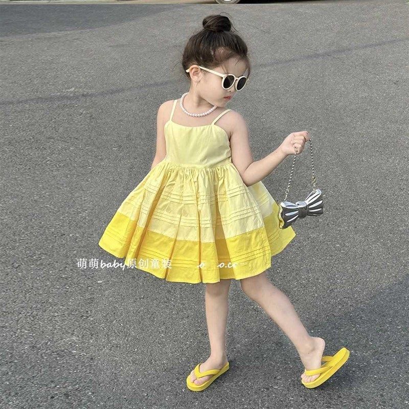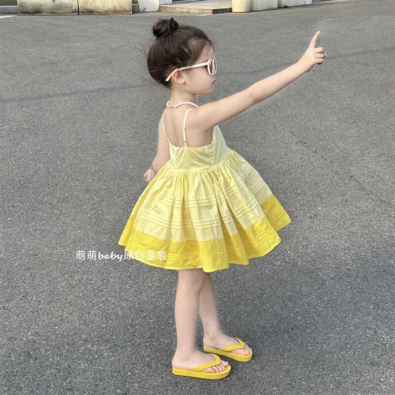 📚 韩国童装2024夏季新款柠檬黄吊带连衣裙女童度假风收褶大摆背心裙