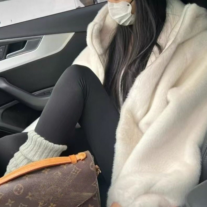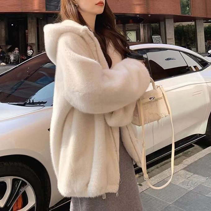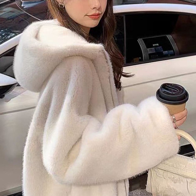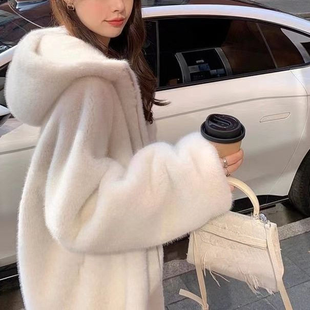 📚 新款水貂绒环保皮草外套女皮毛一体中长款宽松毛绒连帽大衣