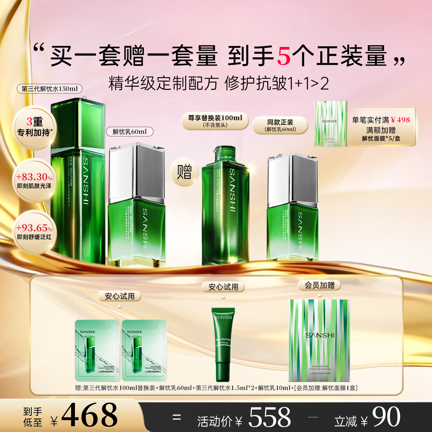 📚 【全新升级】三式解忧精华水乳紧致抗皱女保湿补水护肤品水乳套装