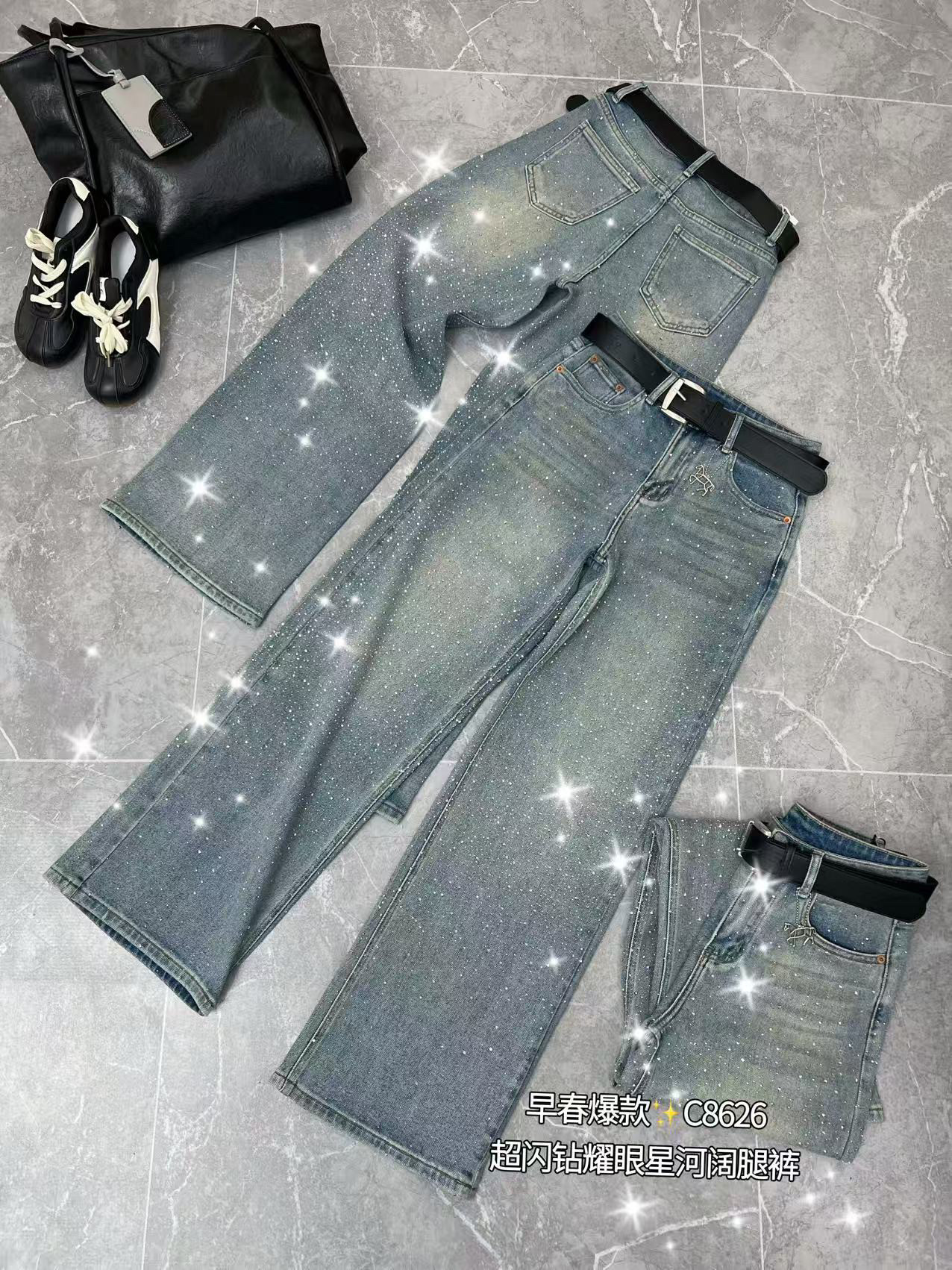 📚 深圳南油牛仔裤女2026早春巴黎爆闪裤复古轻奢直筒阔腿裤重工满钻
