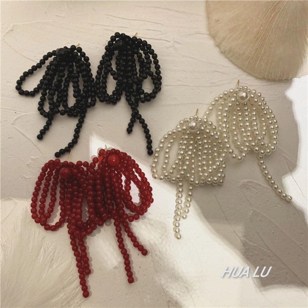 📚 法式小众蝴蝶结珍珠流苏耳环串珠复古夸张气质超仙渡假耳饰耳夹