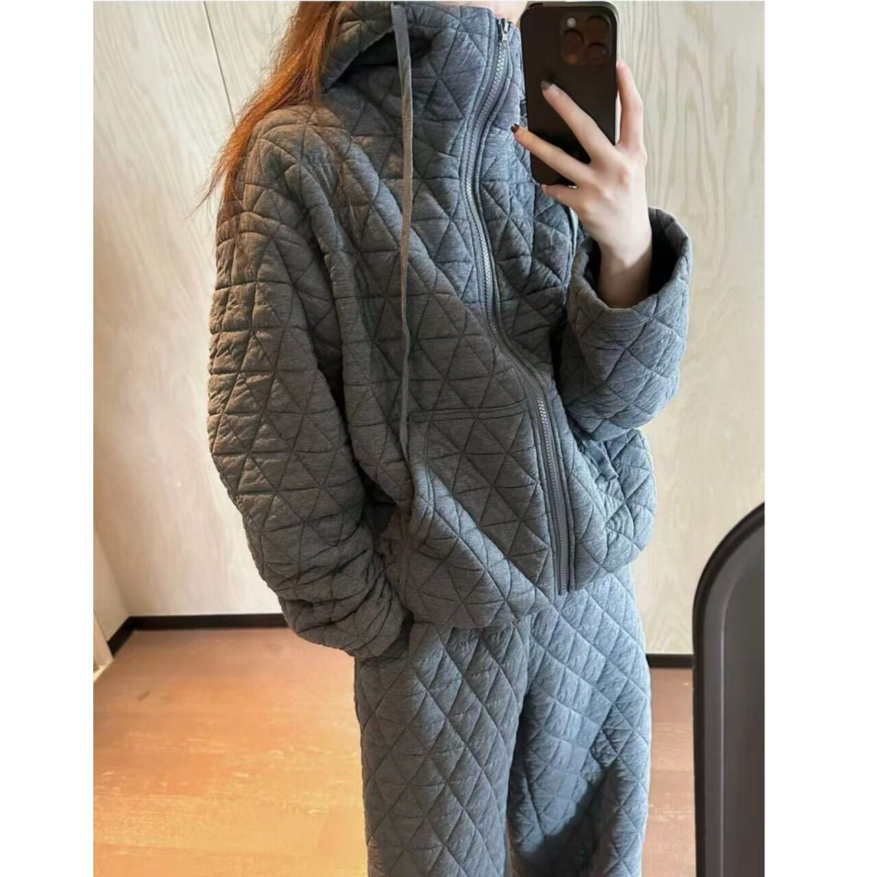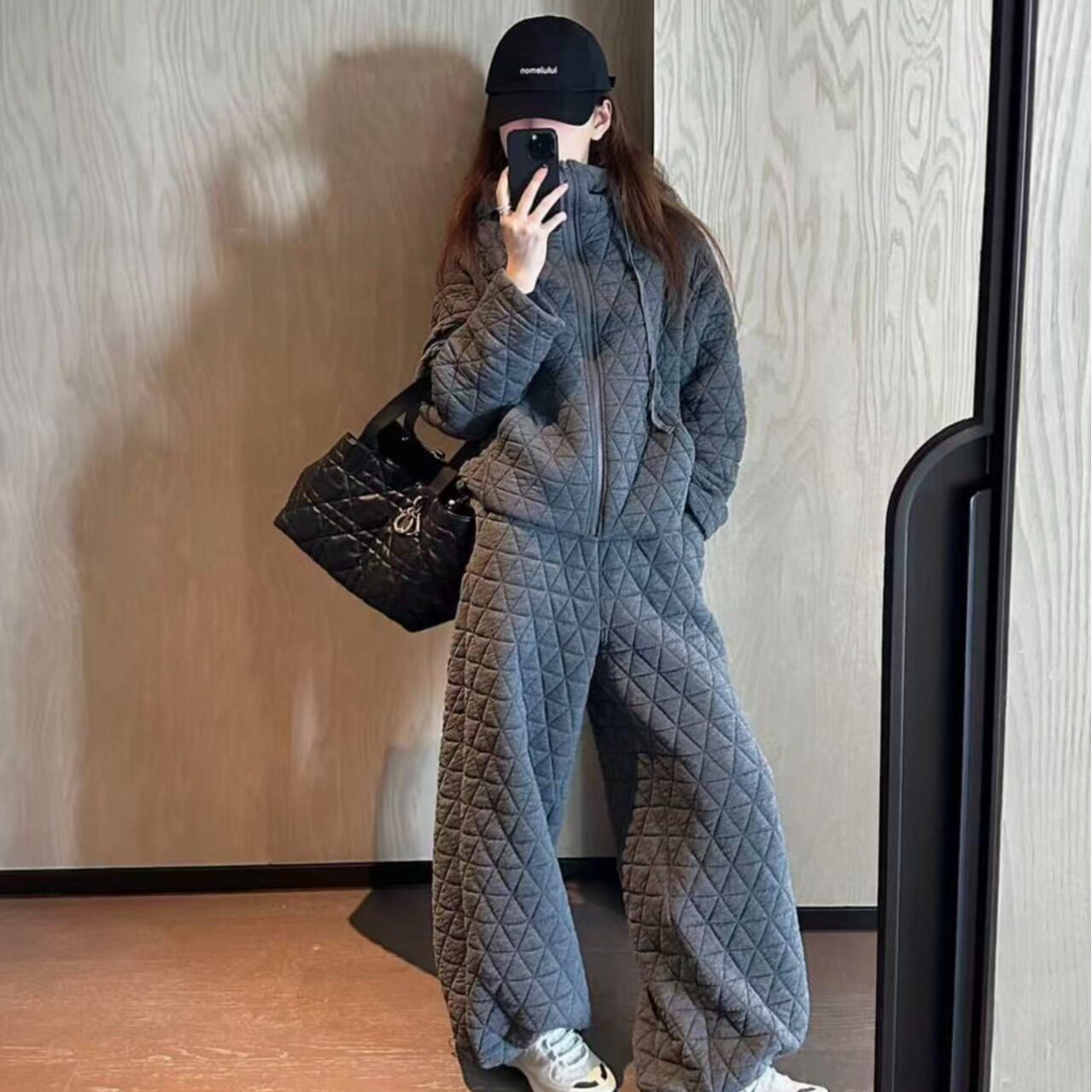 📚 韩国chic2025秋冬新款保暖菱形格上衣外套加宽松橡筋束脚两件套装