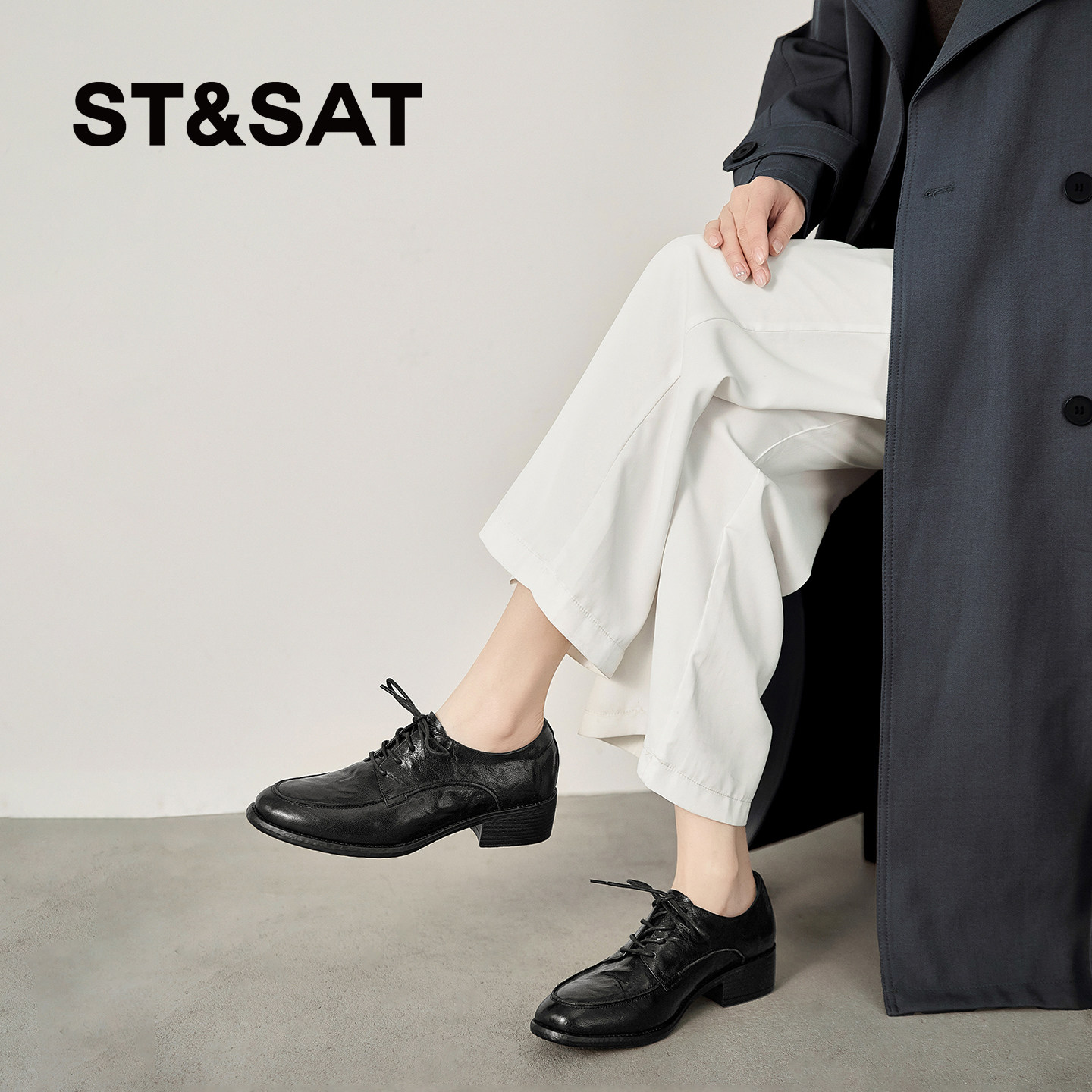 📚 星期六乐福鞋女春季英伦复古系带小皮鞋圆头粗跟羊皮深口单鞋黑色