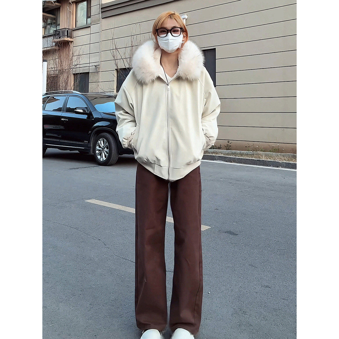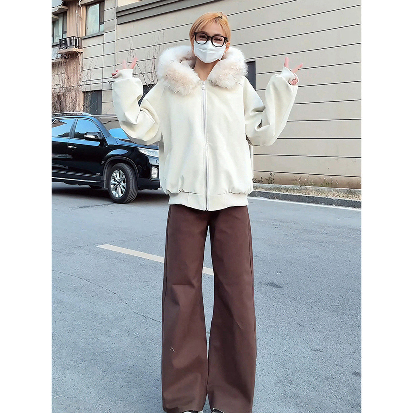 📚 米白色连帽PU皮棉衣男女款冬季加绒加厚毛领外套保暖飞行夹克棉服
