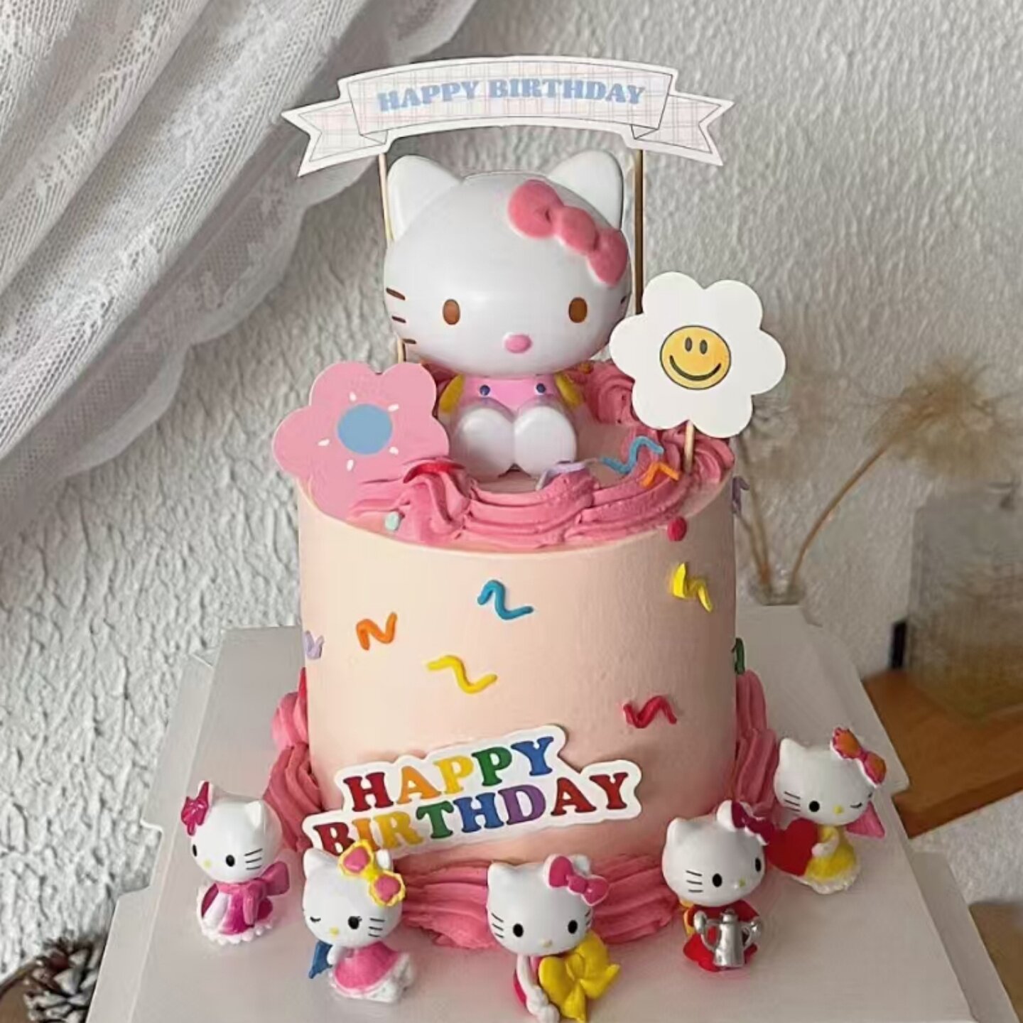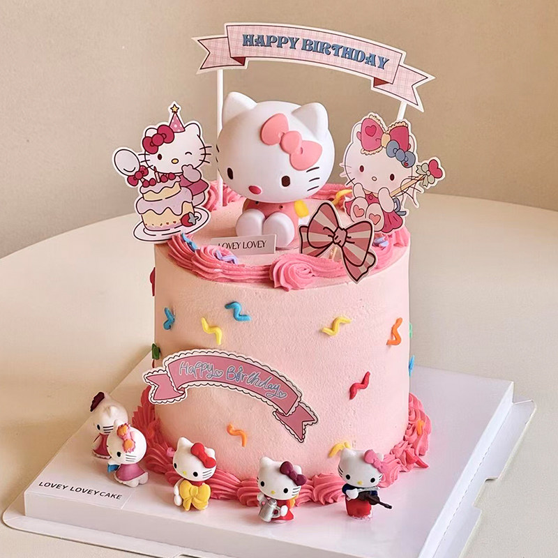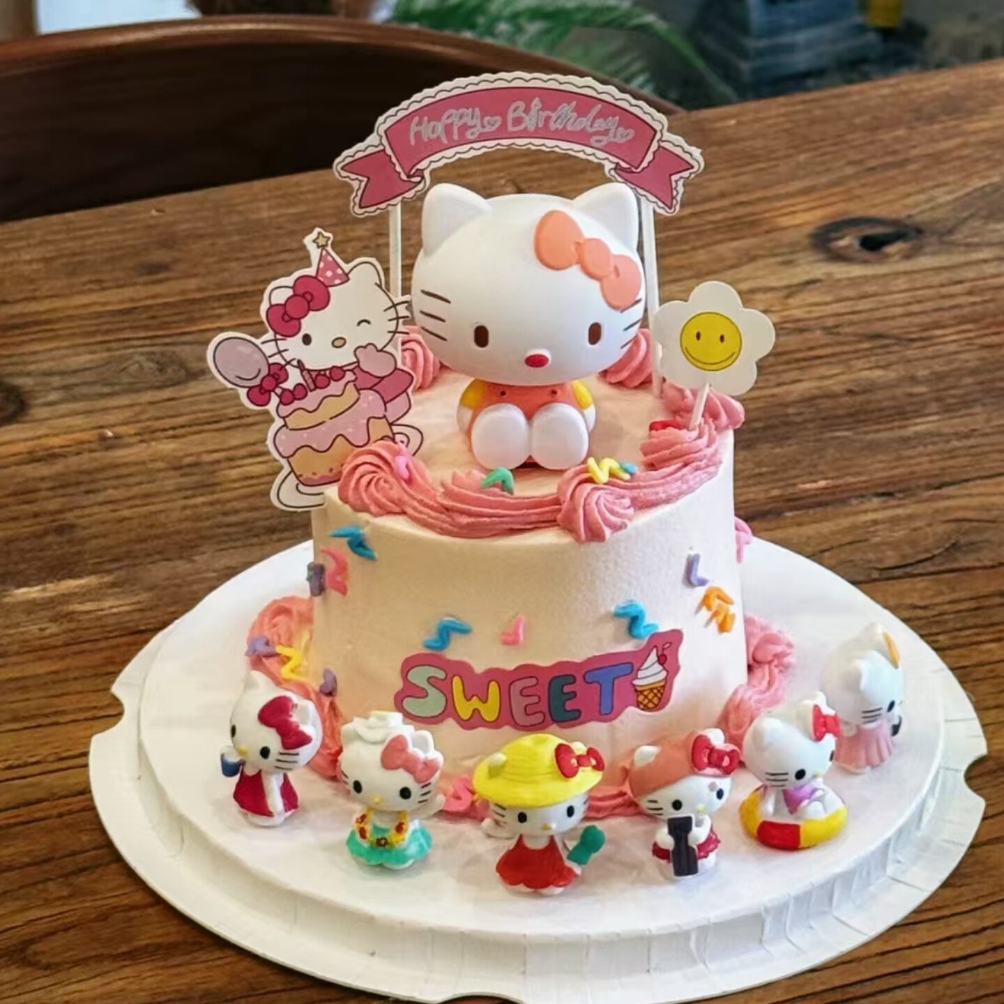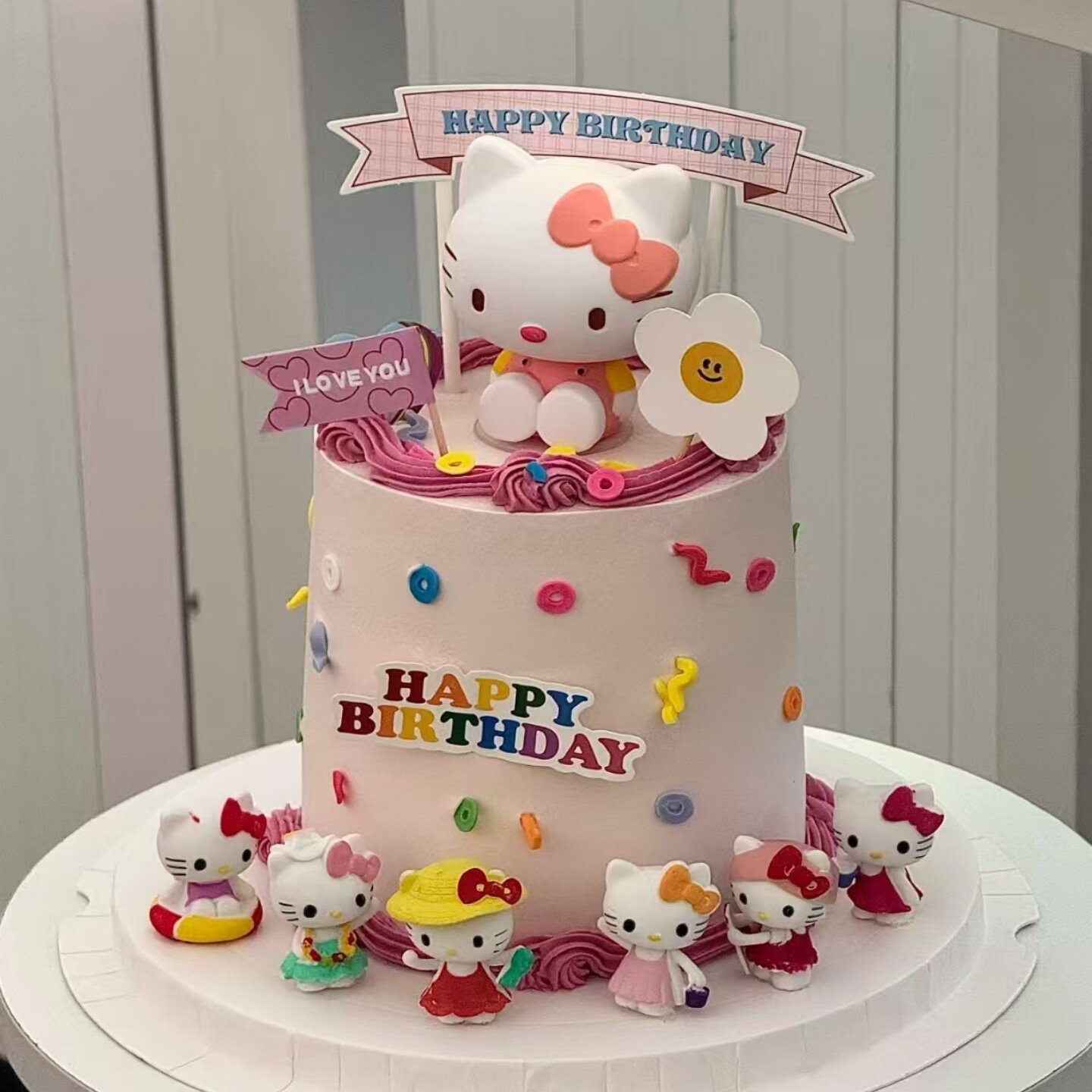 📚 女生小女孩儿童生日蛋糕装饰粉色kt猫四色粉猫摆件粉色系小猫插牌