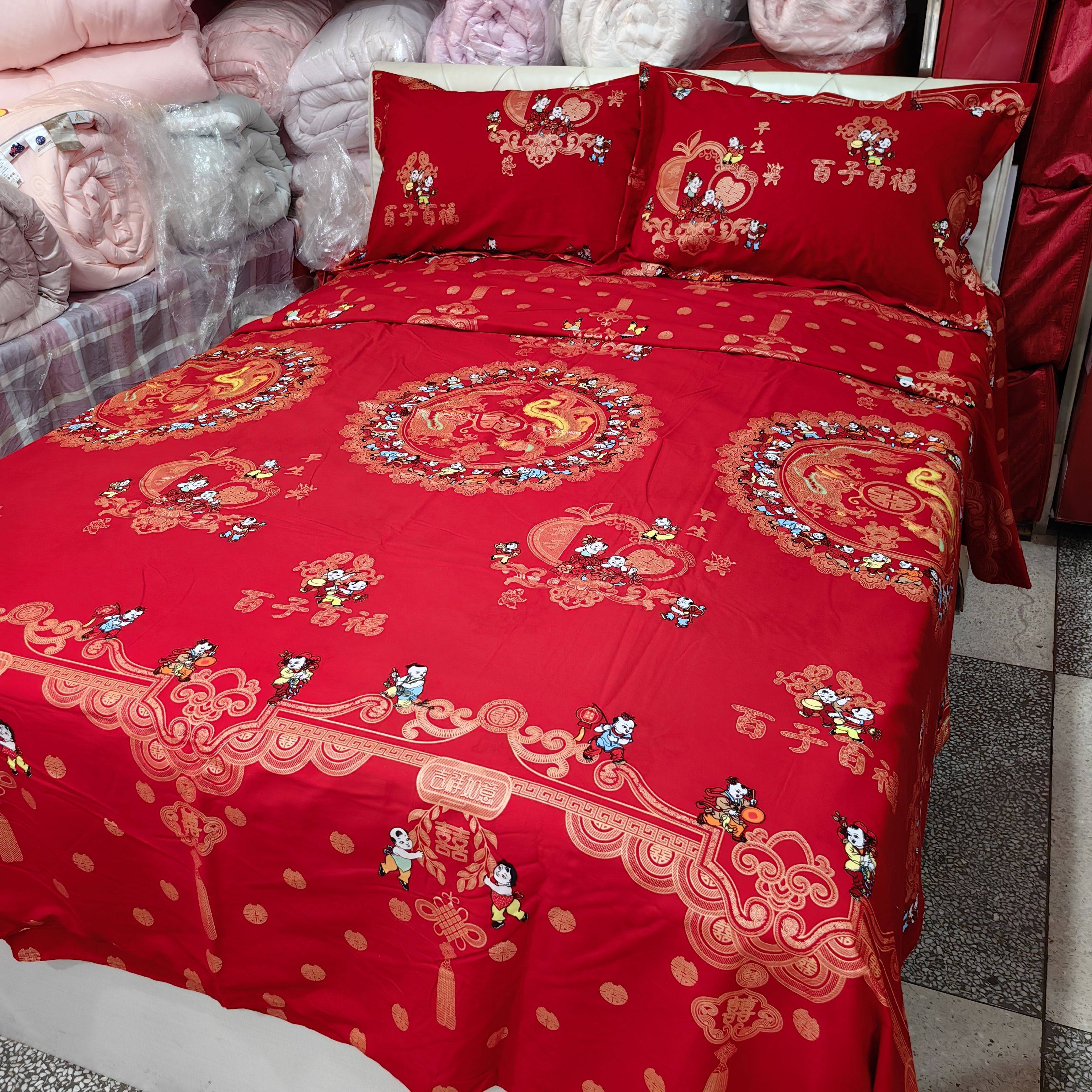 📚 结婚庆被套龙凤喜百子图被面褥子套罩四件套全棉布料大红绿被床单